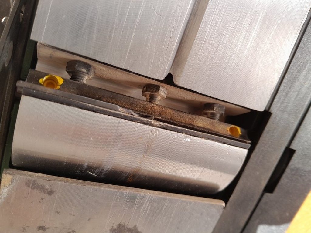 Le rabot possède deux fers placés dans leur support, maintenu par 3 vis. C'est le même système que sur les rabo / dégau : les vis viennent appuyer sur le cylindre, donc il faut visser pour démonter (les vis entrent alors dans le support et se dégagent du cylindre.