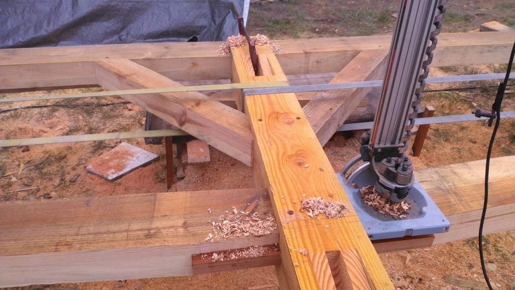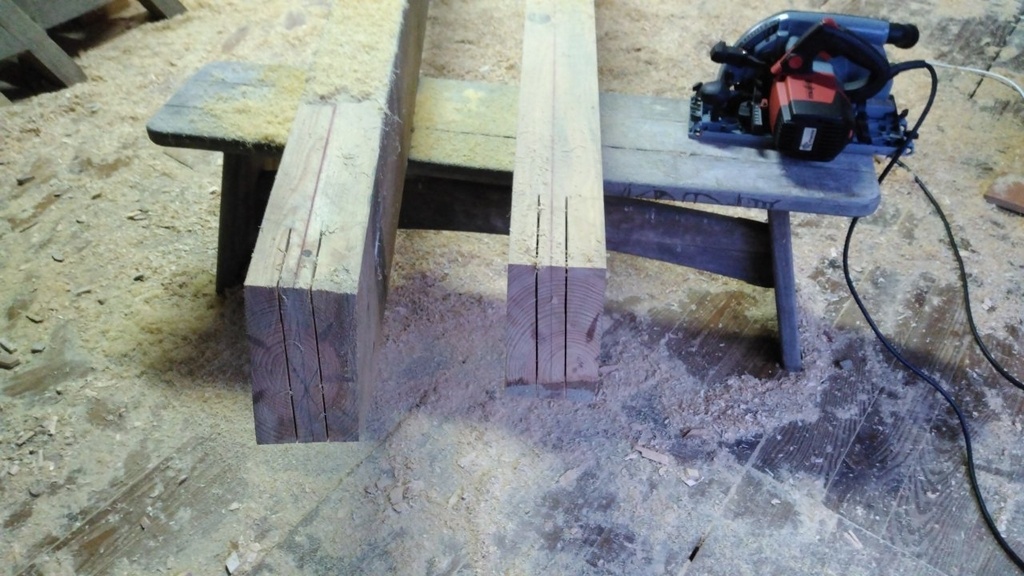 N'ayant pas de bois de cette longueur, j'ai fait une enture avec un 4m et un 2 m50, ce coup-ci j'ai ligné les poteaux, découpe à la circulaire ( j'ai du rajouter une calle sous la petite table, pour incliner la machine dans l'autre sens. Dans de rares cas avec des coupes arrêtées, j'aimerai bien disposer d'une machine avec l'inclinaison inversée ), mortaiseuse, ciseau pour les fonds.