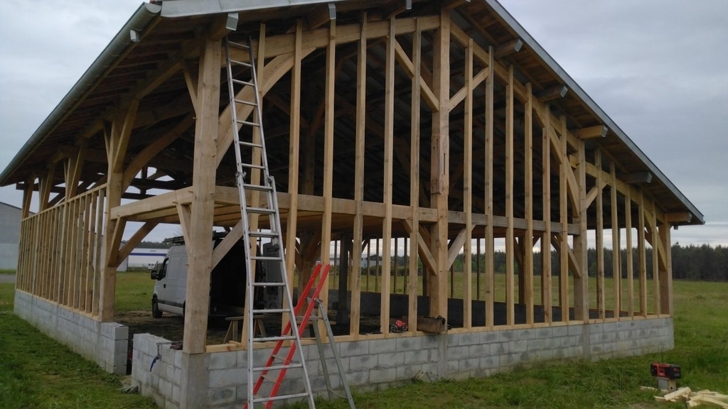 Perçage directement entre poteaux/pannes, pointage liens pour la tire, délardement, idem pour les sablières du côté opposé.