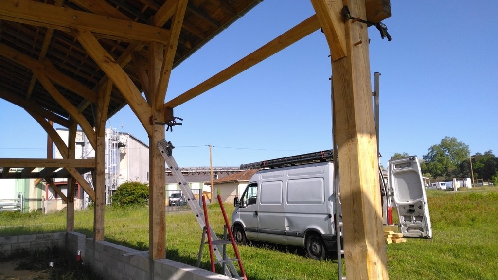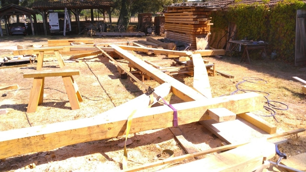 Des serre joints pour bloquer les faîtages, sangles pour jointer les assemblages, pointage des tenons de liens, perçage de tout le reste en place.