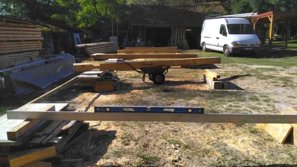 Puis mise à niveau des plateaux en commençant par le point haut du terrain, avec règle et bulle je calle les suivants à la demande, il y a 5 fermes à tailler, autant s'appliquer sur cette étape.