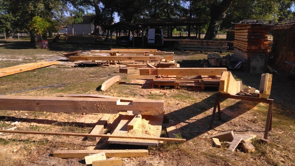 Après avoir mis à longueur les sorties de pannes, j'ai stocké le bois sur deux palettes, une pour les fermes et l'autre pour les pannes, dans l'ordre pour le montage et levage, les dernières à employer en dessous.