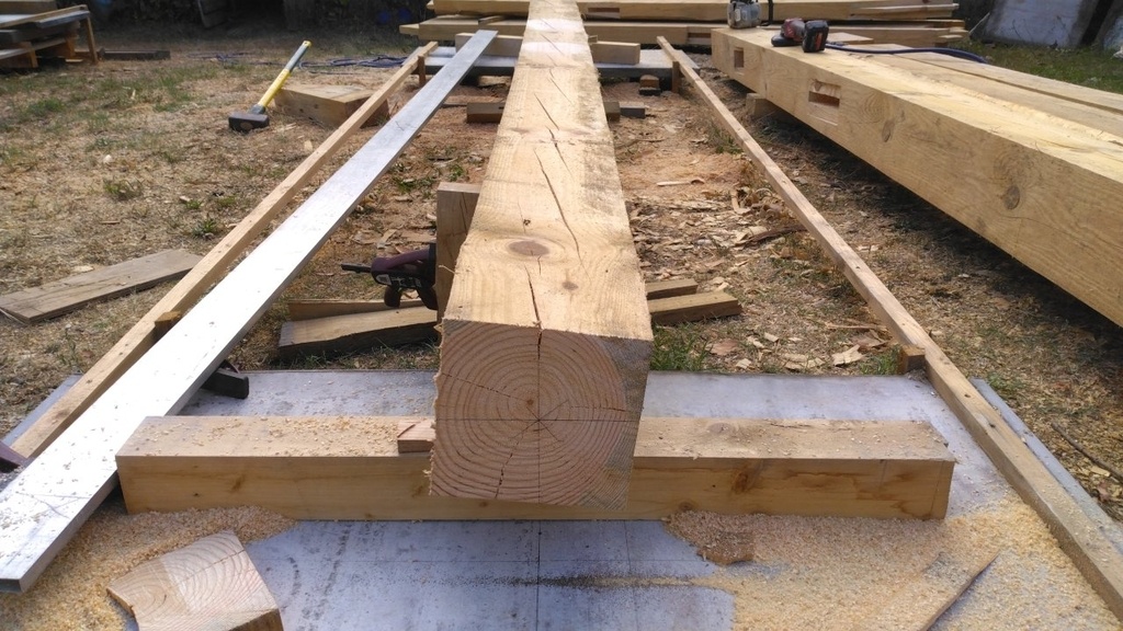 Toujours la même procédure, piquage, mise à longueur, tenonnage, j'ai ligné les arbalétriers sur les tréteaux après avoir tracé la plumée de devers.