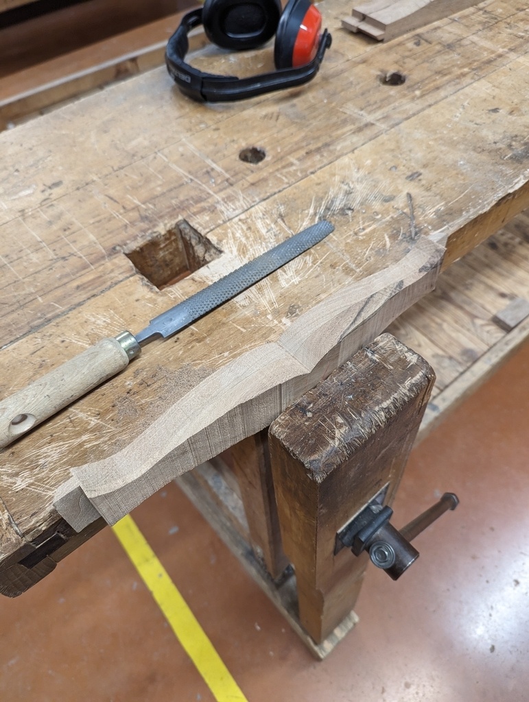 Raccord de la courbe des panneaux et des pieds en travaillant les béquets à la râpe.