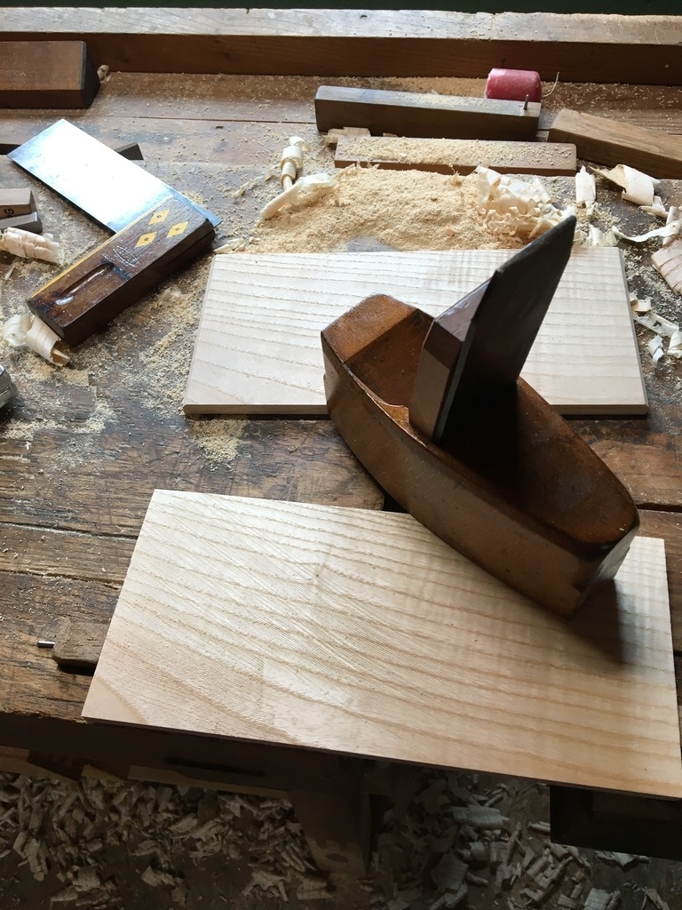 Après rabotage je passe du bichromate pour la teinte puis huile de lin, la finition finale sera réalisée après remontage du meuble.