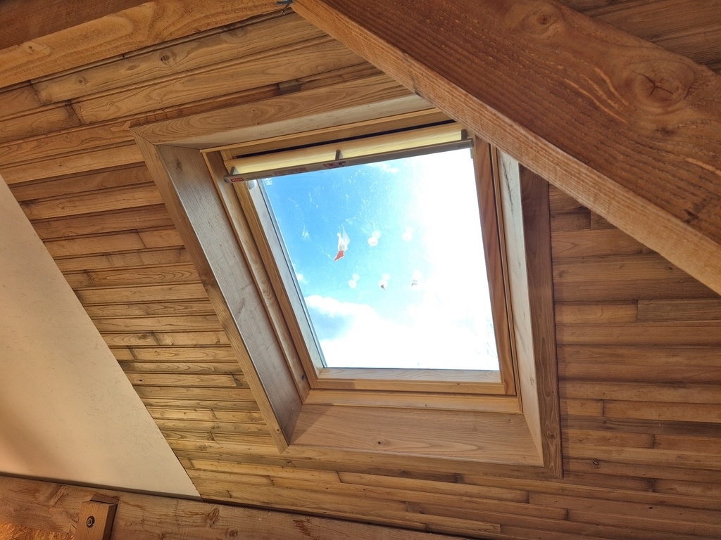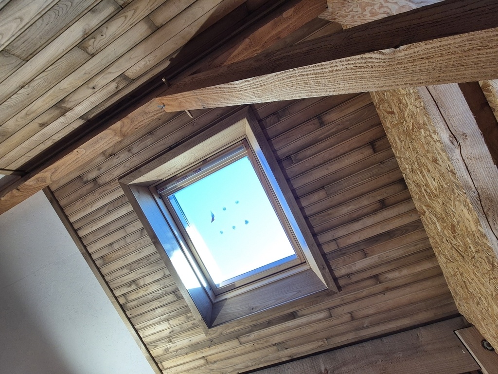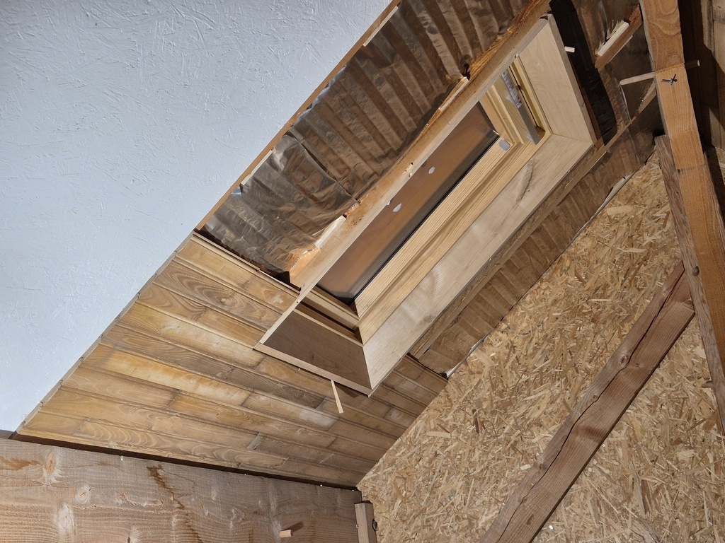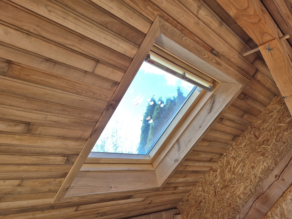 Encadrement du velux tout en châtaignier pour bien se marier avec le lambris.