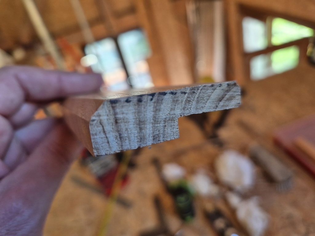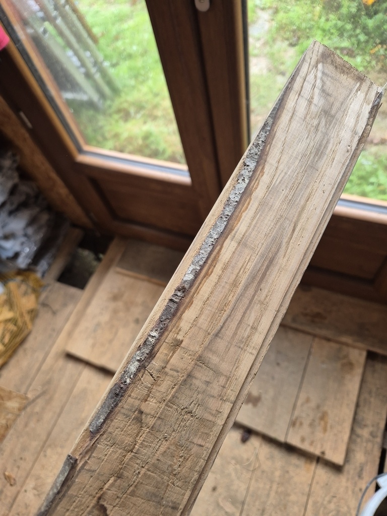 Bonus : le dos d'une lame de lambris de l'arrière grand père : à l'époque on ne gaspillait pas ! Là c'est un cas extrême avec l'écorce, mais beaucoup de lames avaient de l'aubier au dos.