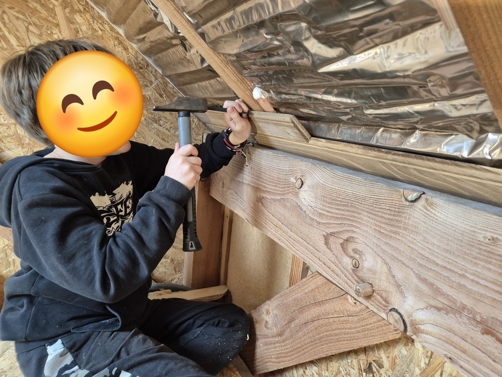 Pour ne pas voir le pare-pluie de dessous, habillage des avant-toits avec du bois de récup. C'est une étape que je n'avais pas prévue au départ.