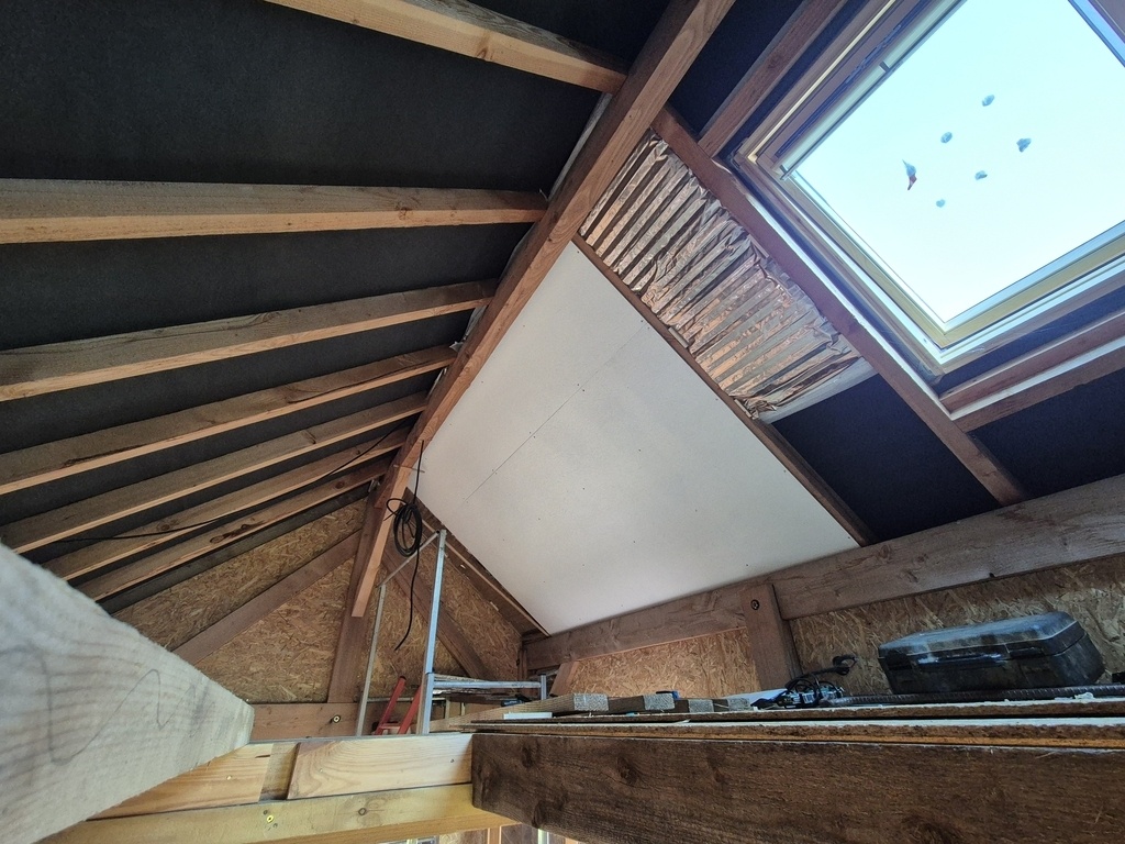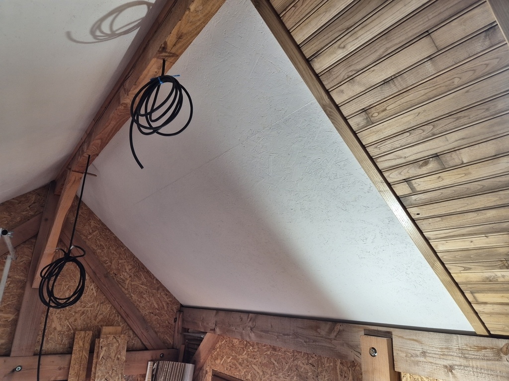 Un peu plus de la moitié du plafond est en osb 9mm peint en blanc. Les plaques sont pré peintes 2 couches avant de les monter.