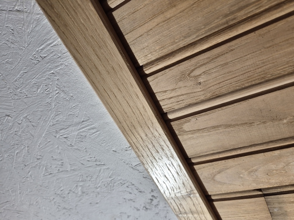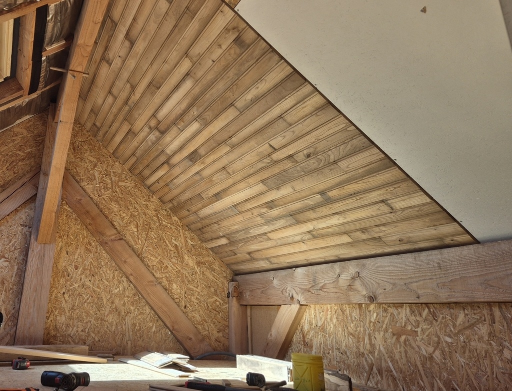 Enfin, un profilé maison, toujours en châtaignier, pour couvrir la jonction entre l'osb et le lambris.