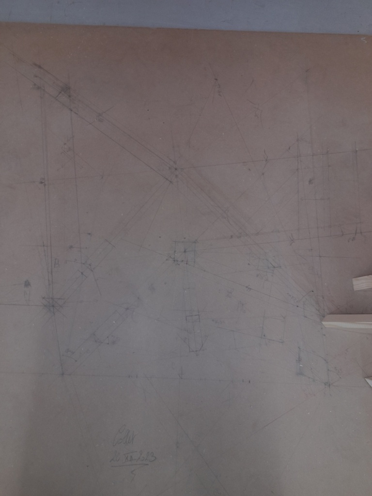 J'avais préparé mon débit mais pas mon aire d'épure. Je n'avais pas de grands panneaux sous la main alors j'ai fait un patchwork de CP, Agglo, MDF et sapin sur des restes de bardage. L'ensemble est moyen, mais n'a étrangement pas été trop génant et j'ai réussi à faire mon épure proprement.