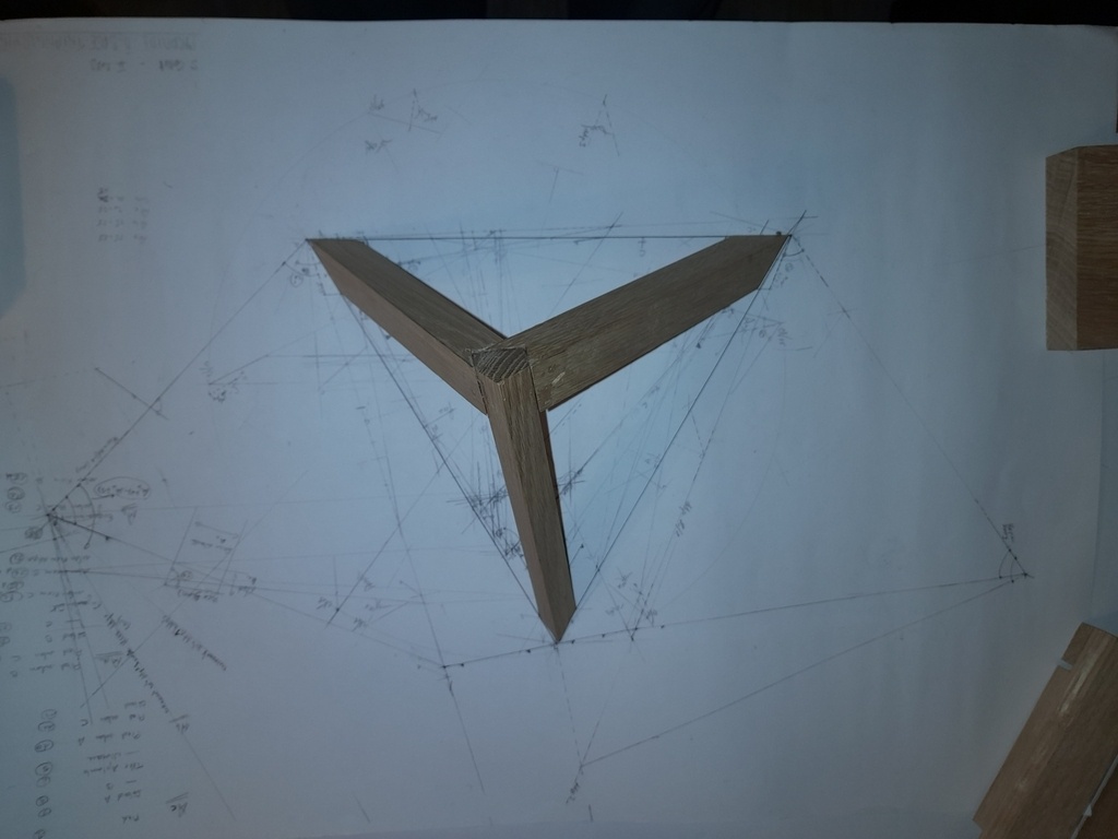Afin de refaire l'exercice à chaud pour valider la compréhension, je l'ai refait en miniature en chêne à l'échelle 1/4, soit un côté de 25cm. L'exercice a été aussi laborieux la seconde fois que la première, mais j'ai fini par faire une pièce assez réussie.