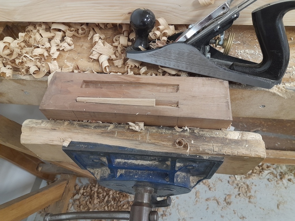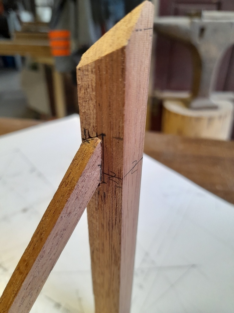 Par contre, je me suis fait le plaisir de rajouter des tenons-mortaises biais au lieu de coupes franches. J'ai ainsi pu tester le principe des cales à devers pour tortiller et faire les délards à la ruban.