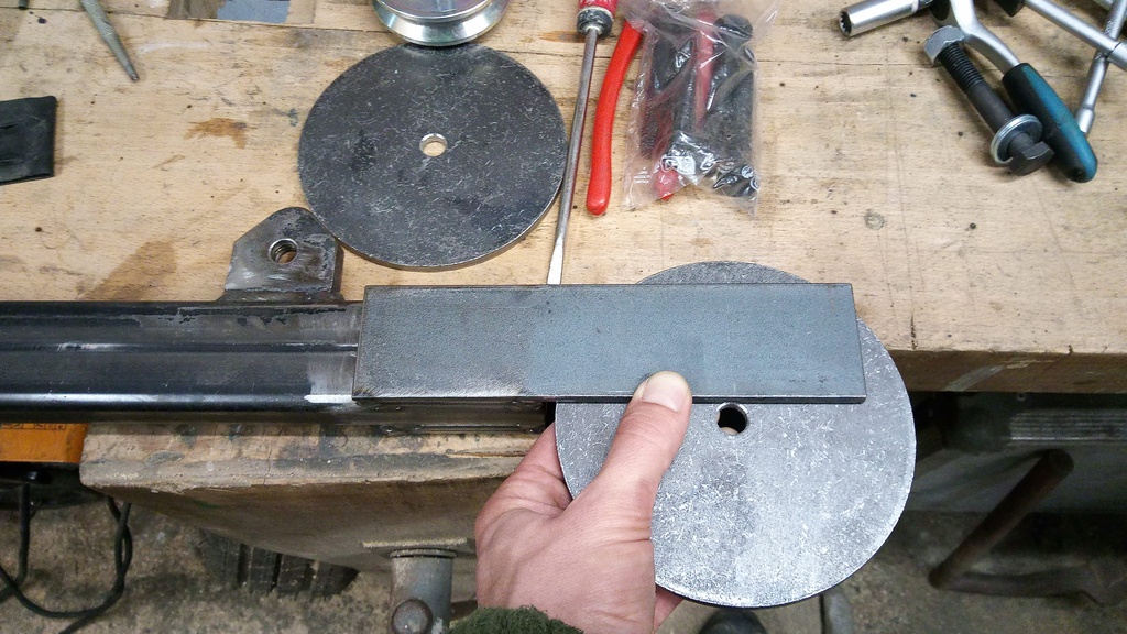 J'ai choisi d'y installer ces deux rondelles larges en 140 mm et 5 mm d'épaisseur pour avoir un bon maintien. J'ai voulu du métal et pas du bois pour tendre vers un "contre poids", j'aimerais délester un peu l'arrière du trinqueballe.