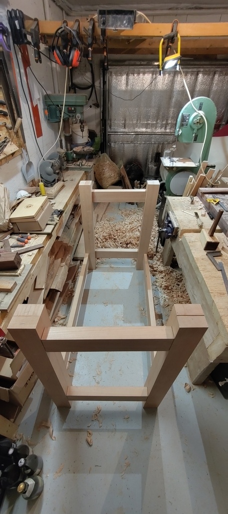 MàJ : les traverses basses sont assemblées. Cette fois j'ai fait les mortaises avec une mèche forstner de 19mm à la perceuse à colonne, puis terminé aux ciseaux. J'ai un bien meilleur résultat, notamment des joues bien droites. J'ai encore quelques ajustements à faire, mais j'ai pas résisté à tout emboîter pour voir le résultat :