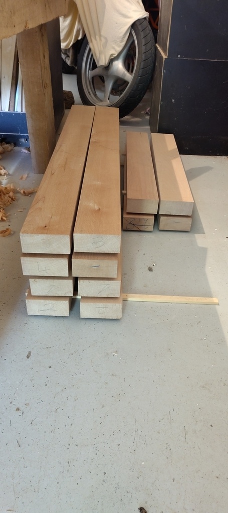 Le piètement sera tout en hêtre ! J'ai laissé le bois s'acclimater dans le garage pendant deux semaines. En attendant, j'ai terminé le plateau : derniers ajustement des surfaces au rabot pour que ça jointe correctement, et collage des plateaux ensemble.