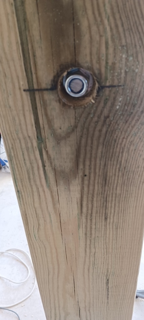 En resserrant la sangle, j'ai pu visser les tirefonds de 10x140 pour obtenir un assemblage à peu près correct malgré le fait que les pièces aient tendance à tuiler.