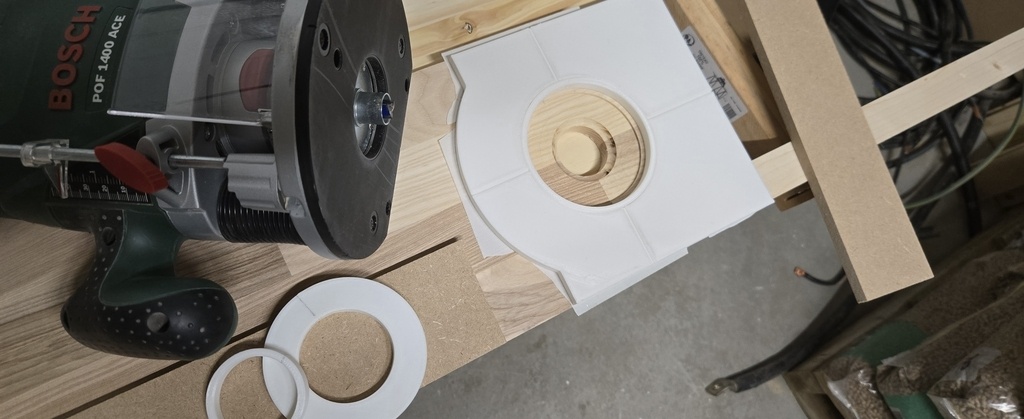 Je réalise donc des gabarits pour la défonceuse, une cale à poncer pour le gros quart de rond de D=125 mm.