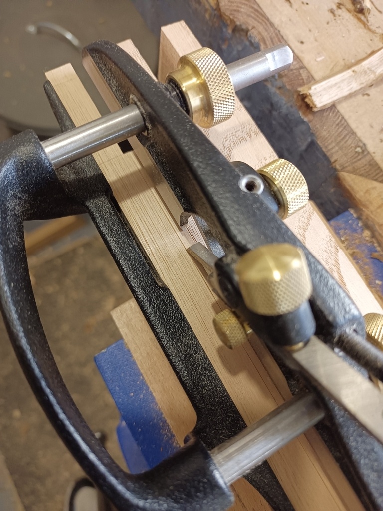 Les pièces sont en 58 de profondeur (pour accueillir un vitrage de 4/16/4) et devaient faire 75, 65 et 55 de large (traverse basse, haute et montants). J'avais oublié de vérifier le guide de la dégau...j'ai rattrapé le faux équerrage à la varlope et les cotes en largeur ont perdu 5mm. La surface vitrée n'en sera que plus grande!