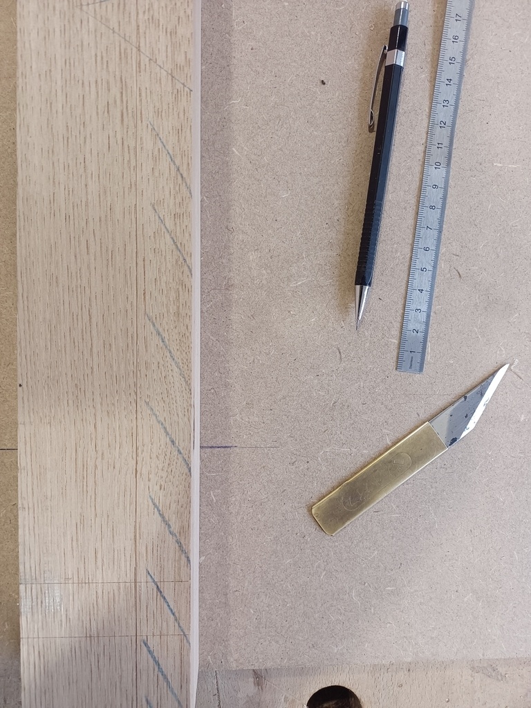 On établit les bois. Je reporte la mesure intérieure du dormant en retirant 2x2mm de jeu. Les repères d'épaulement sont reportés directement à partir des traverses. Je trace un second trait à 20mm, qui est la profondeur de la feuillure. Traçage de l'onglet et on hachure pour ne pas se tromper (mesure tout à fait insuffisante contre la c***nerie, cf infra). La feuillure est également tracée.