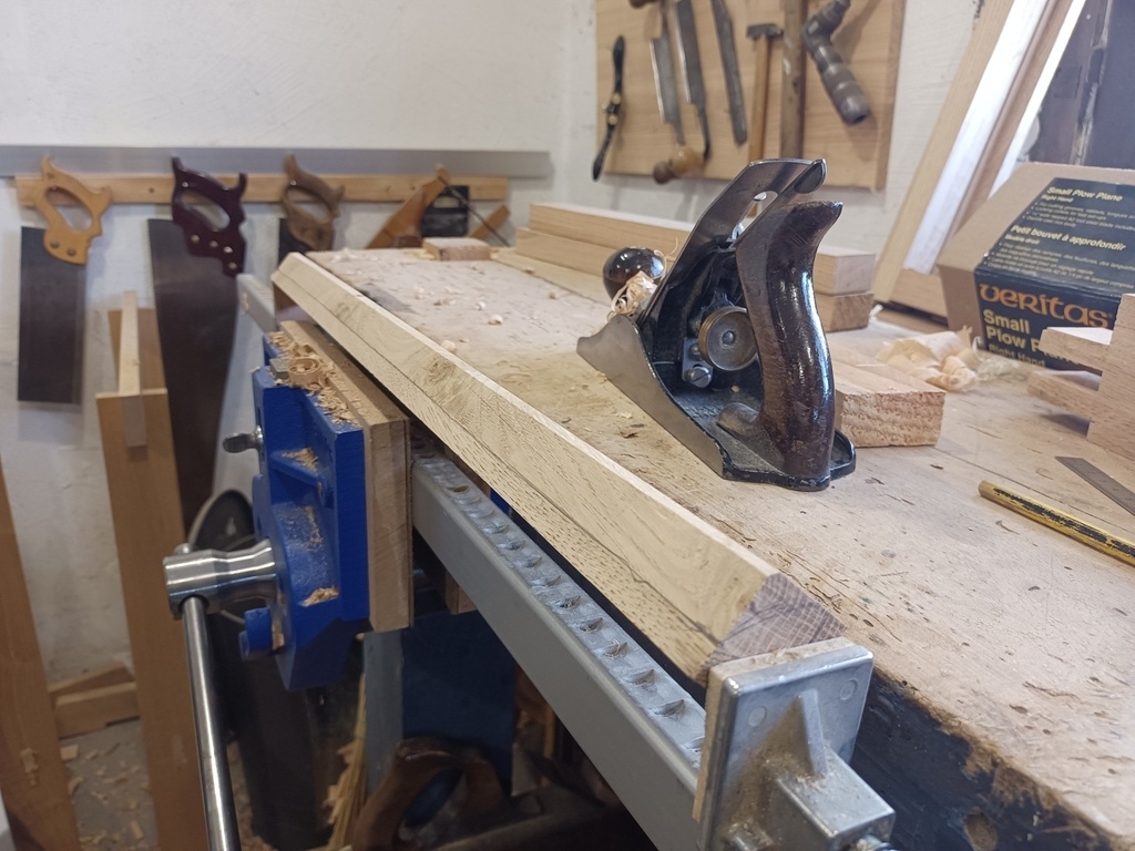 C’est une pièce d’apprentissage (destinée malgré tout à être posée en remplacement d’un vieux simple vitrage). J’en ai donc profité pour liquider de vieux plateaux de chêne en 27 qui trainaient. Et ils ne trainaient pas pour rien ! plein de nœuds à éviter, du contrefil etc. Tant que ça me permet de faire les carrelets, je prends. Si le projet va au bout dans des délais raisonnables, je me lancerai peut-être dans des croisées plus importantes en soignant, cette fois, la sélection des bois.