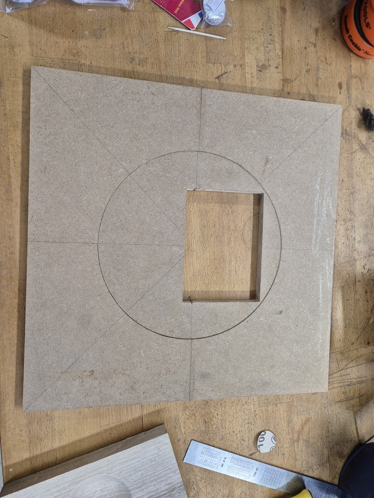 Un disque inscrit dans une découpe circulaire. Une découpe ajustée à la taille de la semelle de la lamelleuse avec la lame de la lamelleuse positionnée sur le diamètre du cercle