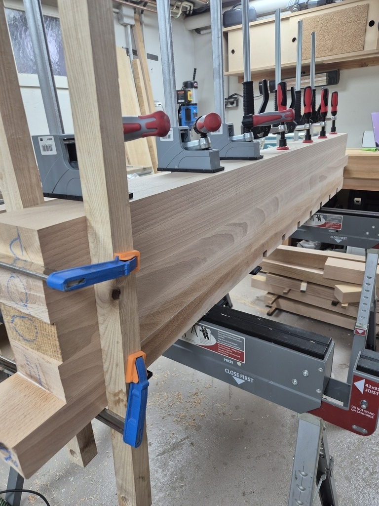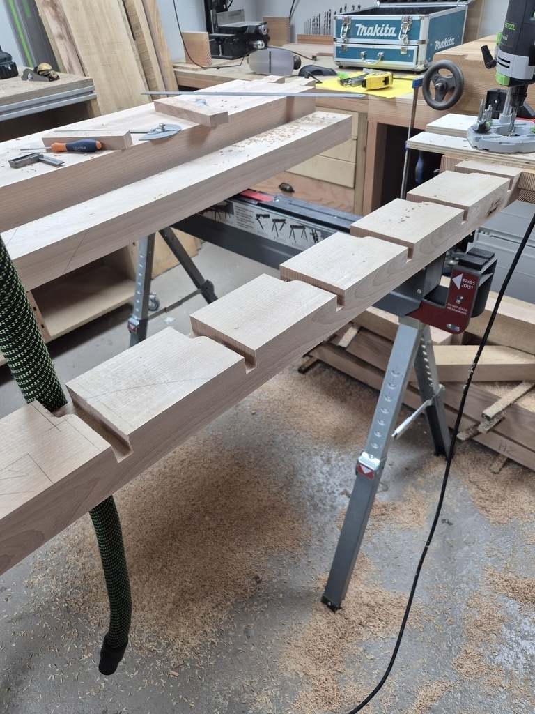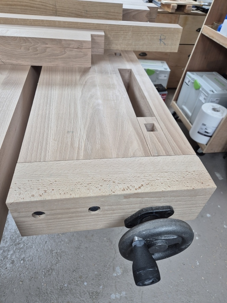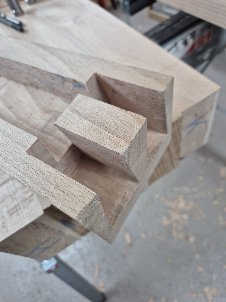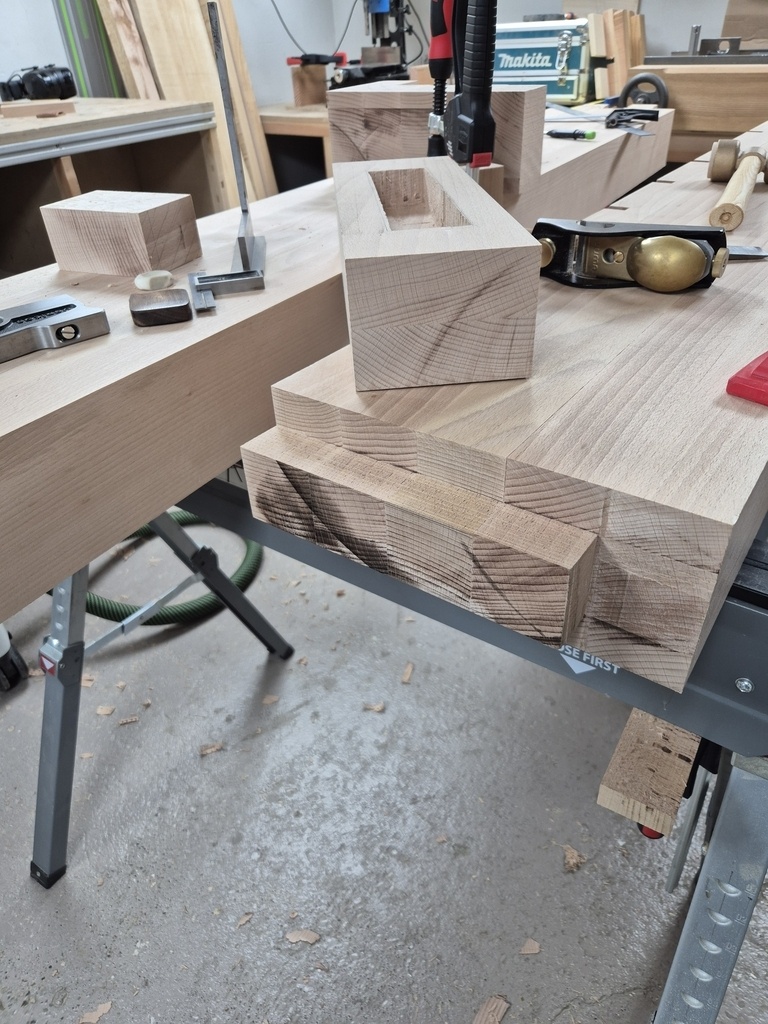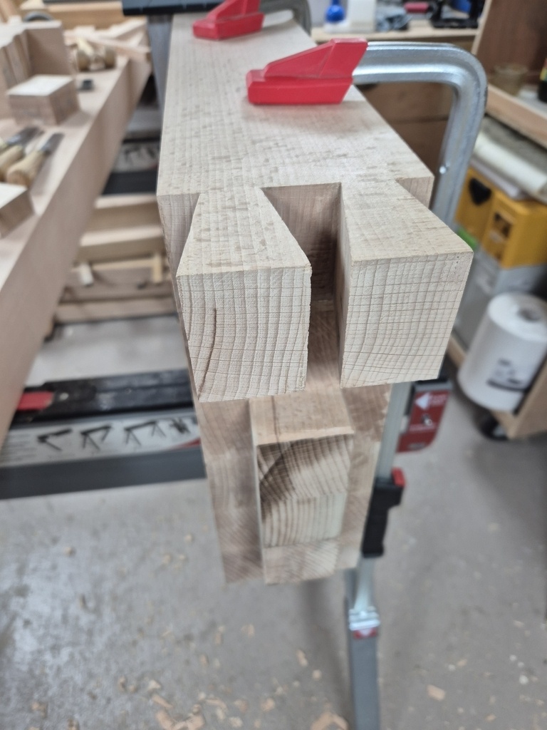 - Chaque couple de pied (gauche et droite) sera assemblé aux 2 traverses courtes via tenon/mortaise, collé et chevillé à la tire.