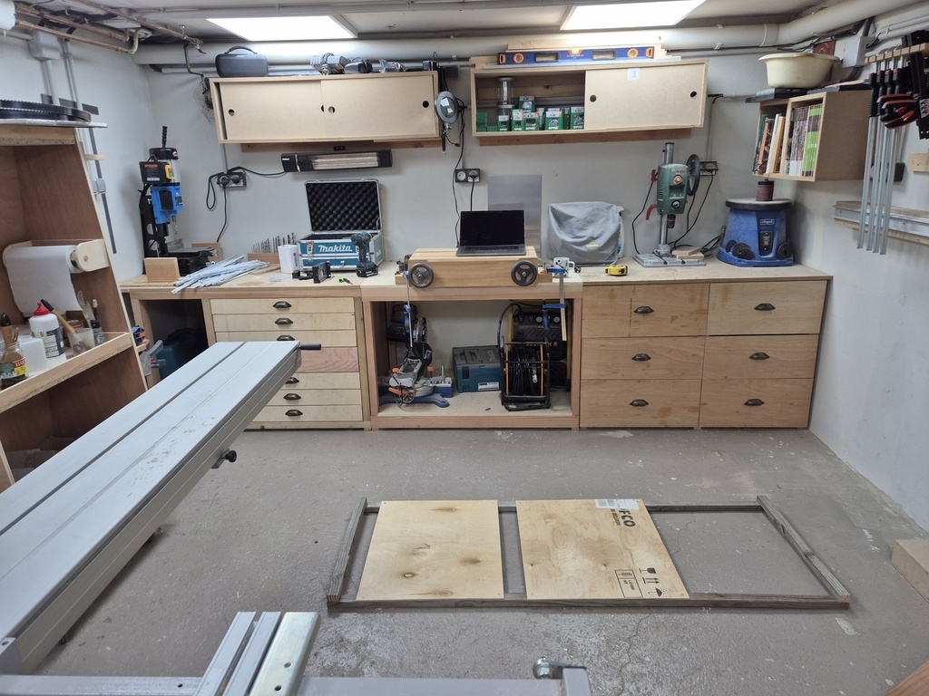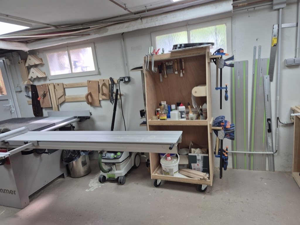 Ici, je peux tourner autour. Par contre, cela nécessite de déplacer sous la fenêtre le meuble colle et serre-joint ... qui prend de la lumière, et surtout qui gênera la coupe de panneaux.