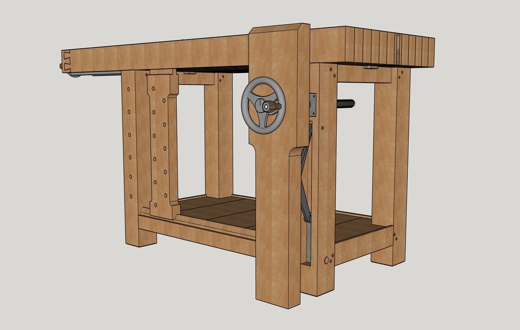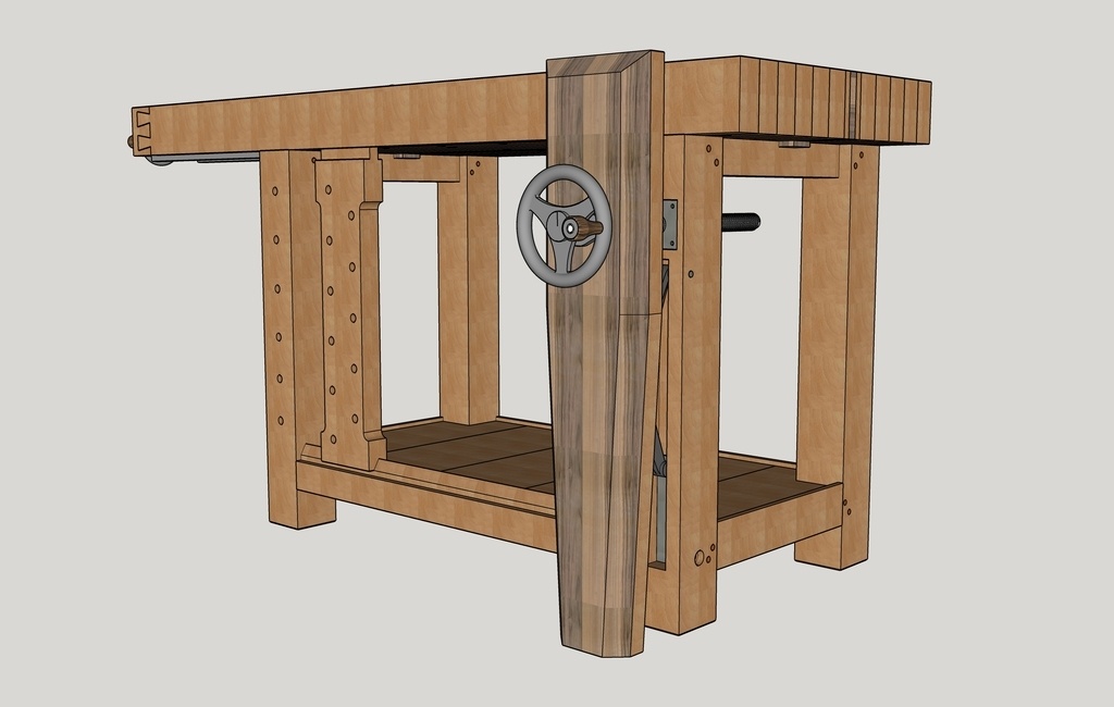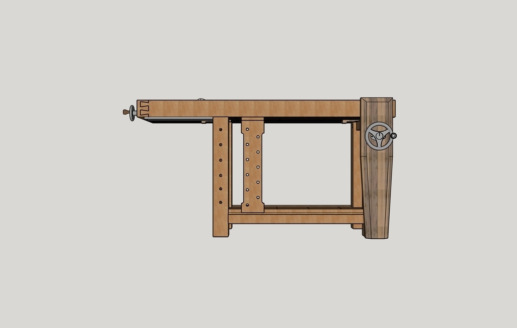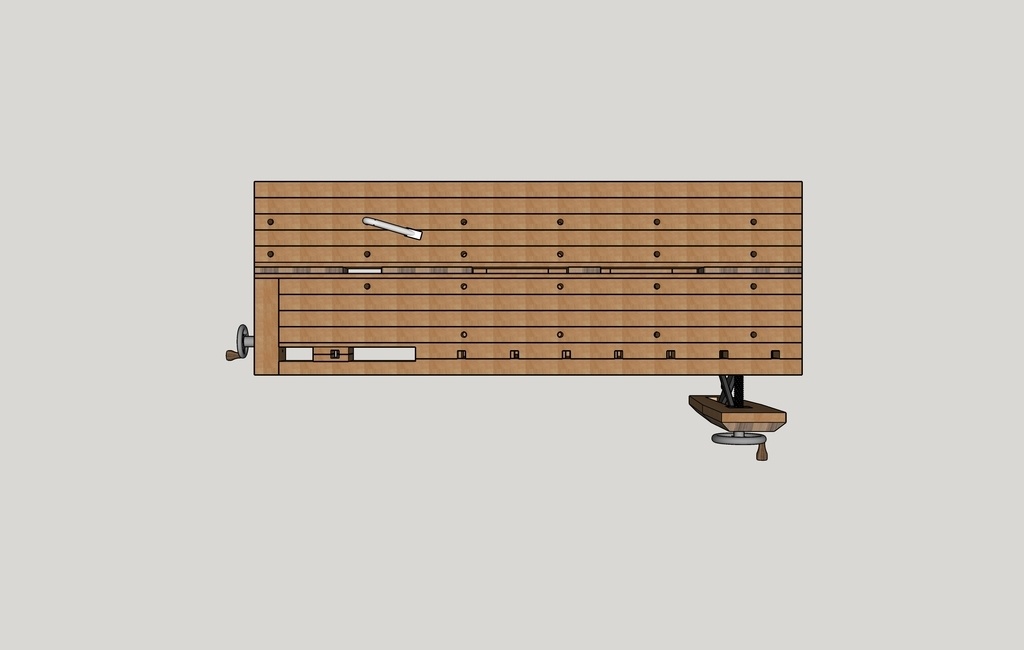 Détail esthétique, j'ai choisi une presse frontale pas tout à fait "classique". Je trouve que cela donne un coté plus moderne à l'établi. Ci-dessous les 2 essais :