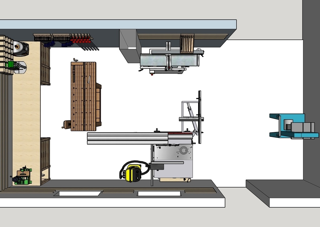 avec une vue de l'établi incrusté dans l'atelier que j'avais modélisé dans SKETCHUP il y a qq années.