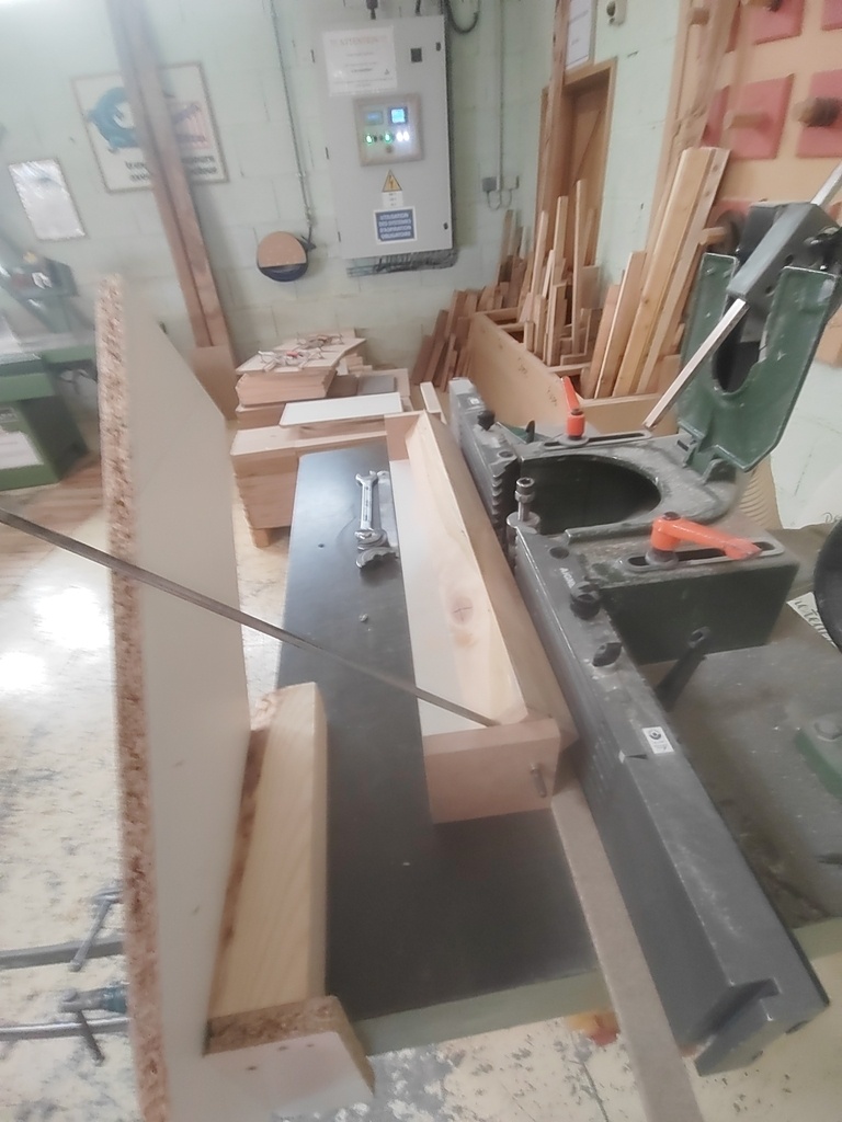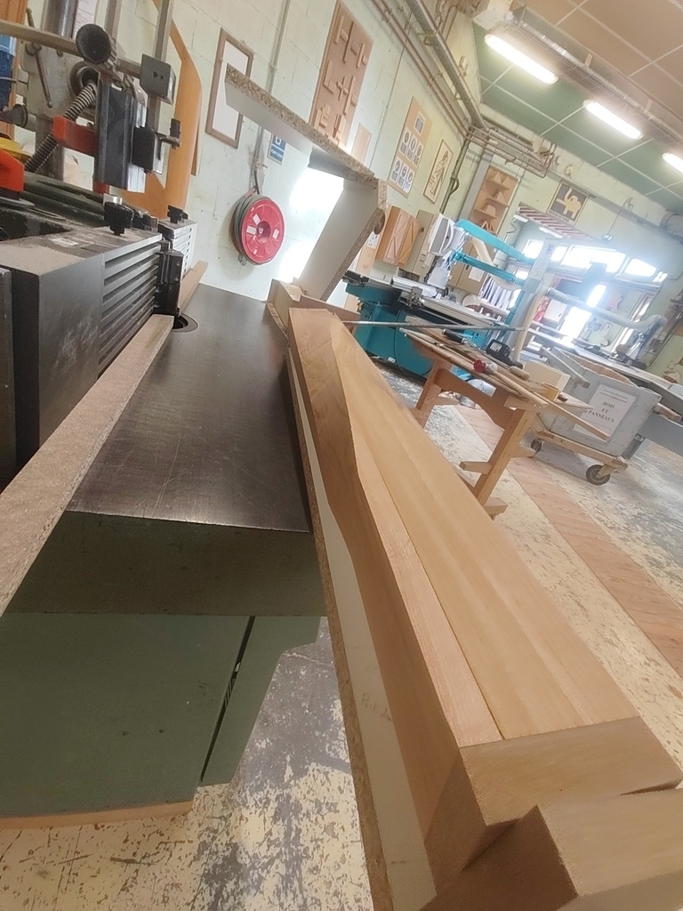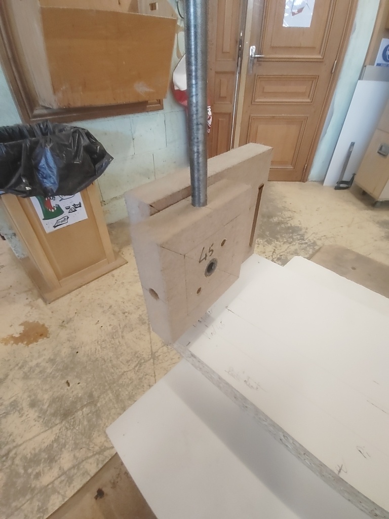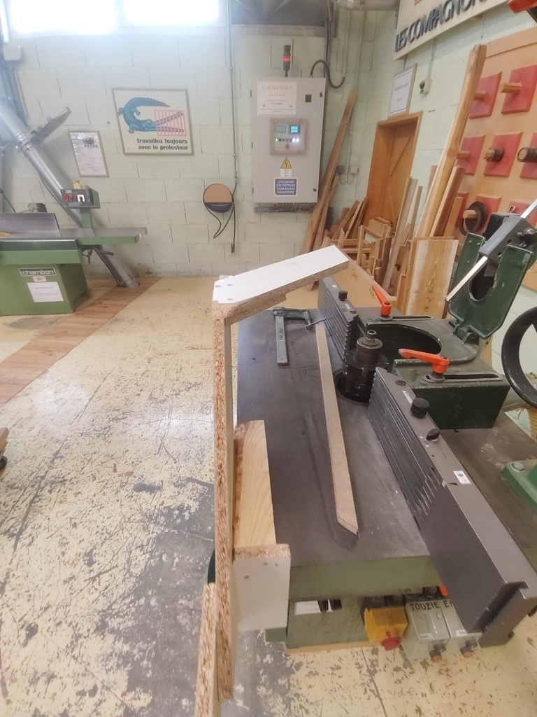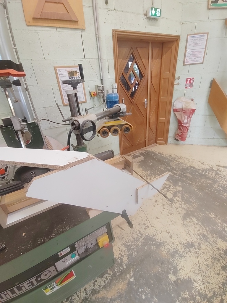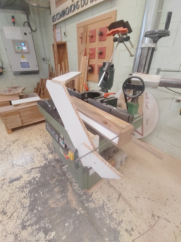 Il a fallu que je me déporte du guide parallèle avec deux morceaux de 30mm pour permettre à la pièce de tourner sans toucher ledit guide. Ces morceaux sont collés à la table au double-face.