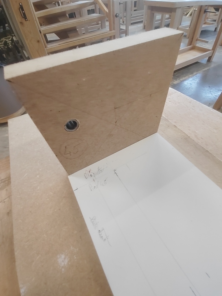 Pour positionner les différentes pièces, j'ai tracé sur le panneau support, afin de ne pas faire d'erreurs. Un détail qui a son importance: j'ai voulu faire en sorte d'avoir un plat sur 100mm sur le haut du pied afin de pouvoir joindre de futures traverses sans avoir à réaliser des arasements gauches.