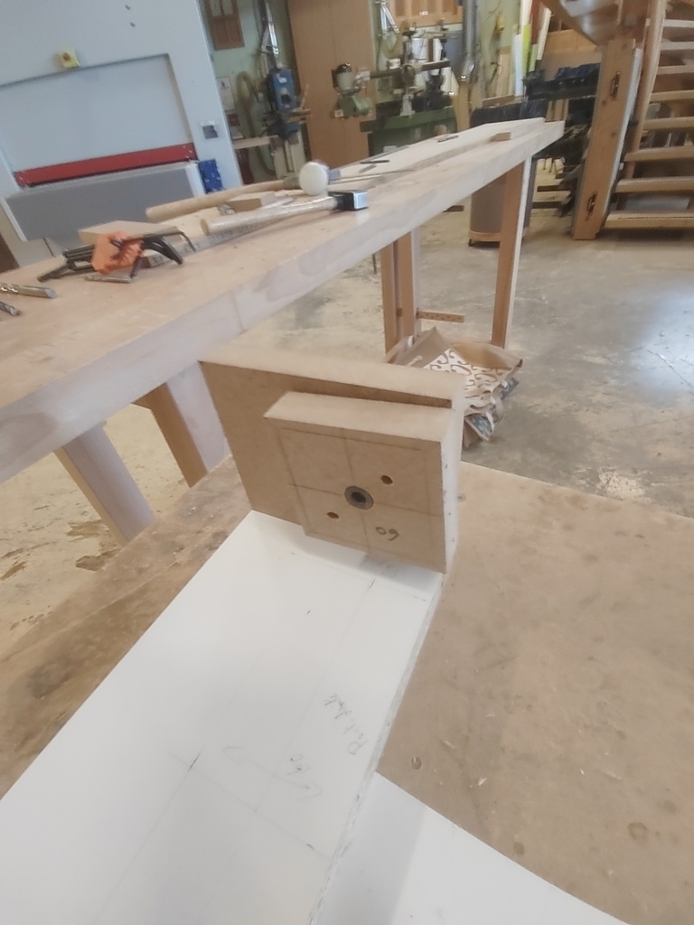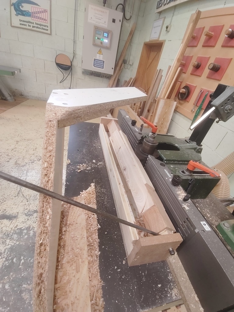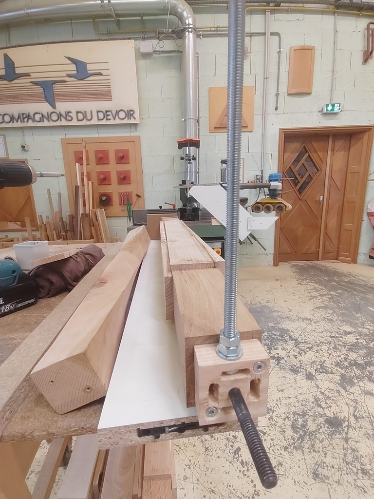 J'ai ajouté un petit bout pour assurer que le départ reste bien de niveau sur la distance voulue. J'ai également fixé des tasseaux pour permettre de démonter le gabarit et le repositionner à l'identique au moment opportun, n'ayant pas prévu de réaliser les pieds torses pour une table complète sur le moment.