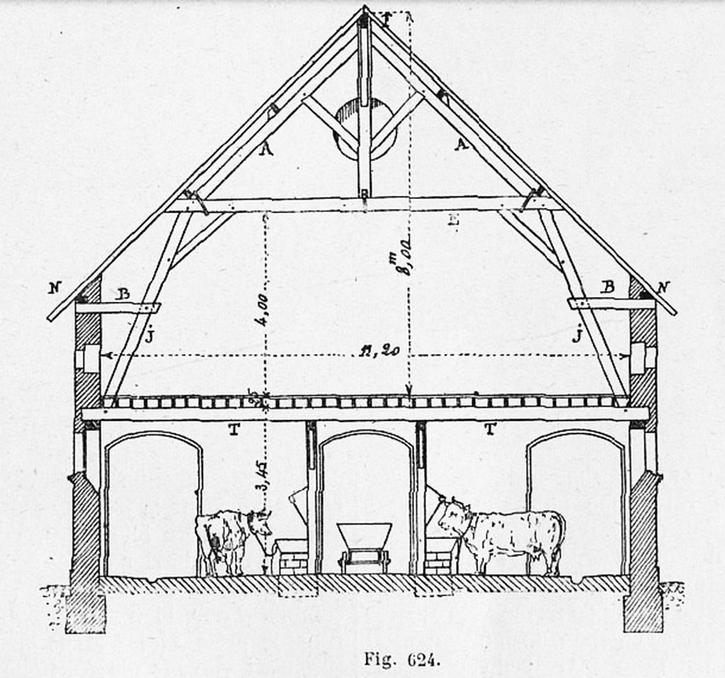Voir Oslet (1890) Traité de charpente en bois, chap. V des combles, VI. combles à deux pentes, 4° combles à trois pannes, § 448, p. 272.