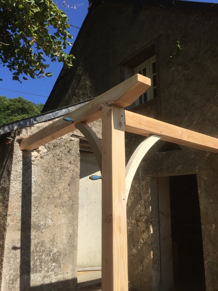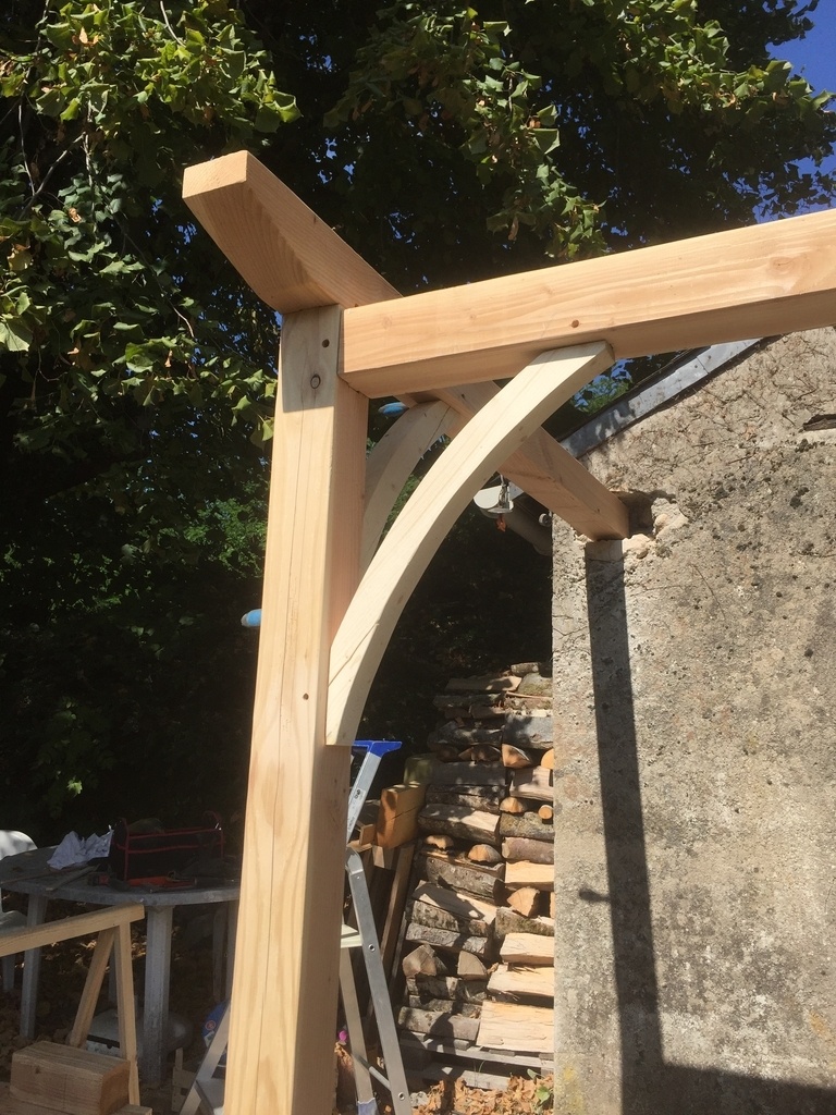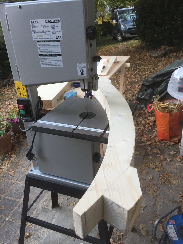 Je fabrique les contrefiches dans un bastaing récupéré ; j'ai un peu galéré pour la courbure, le scie à ruban que j'avais était un peu en peine .