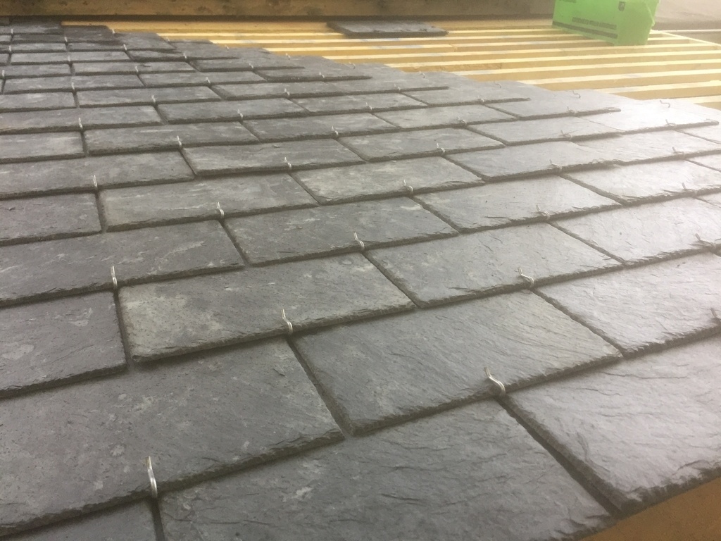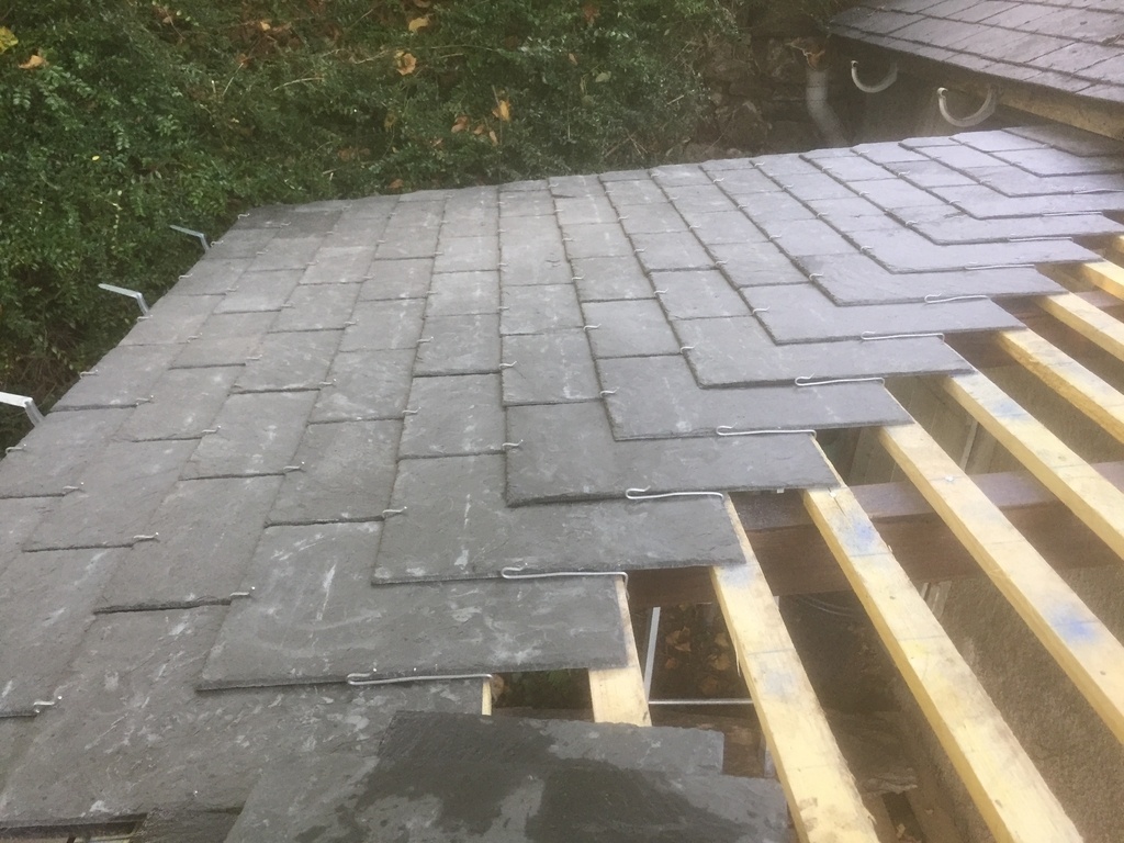 Cette fois pas de volige mais pose directement des liteaux en vue de la pose des ardoises aux crochets .