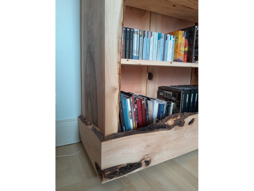 J'aime bien le concept et le rendu assez sympa. Tu as eu de la chance de trouver de telles planches. Perso, mais ce n'est que mon avis d'après tes photos, j'aurai diminué la taille du socle qui alourdit l'ensemble et j'aurai inversé le sens de pose de la planche du coté droit. Je trouve plus joli l'arrière que le devant. Le coté gauche gauche me plait bien comme il est.