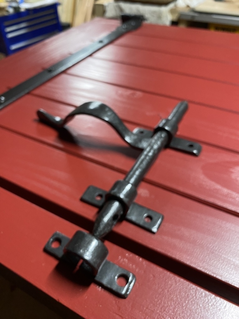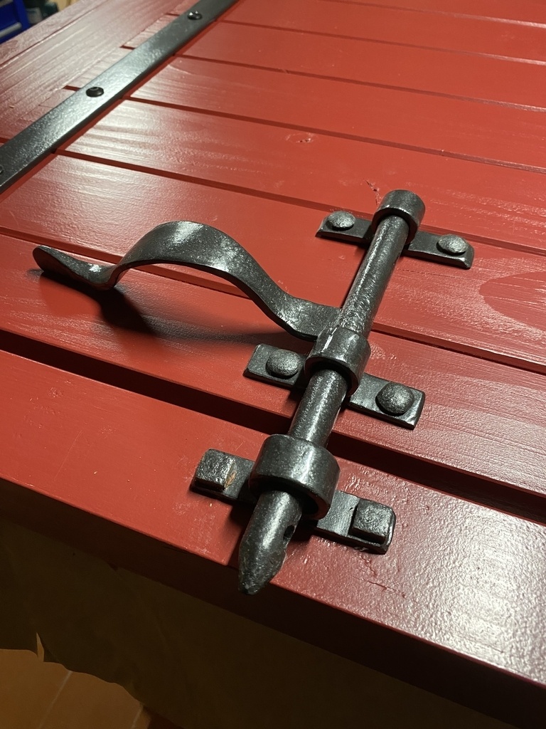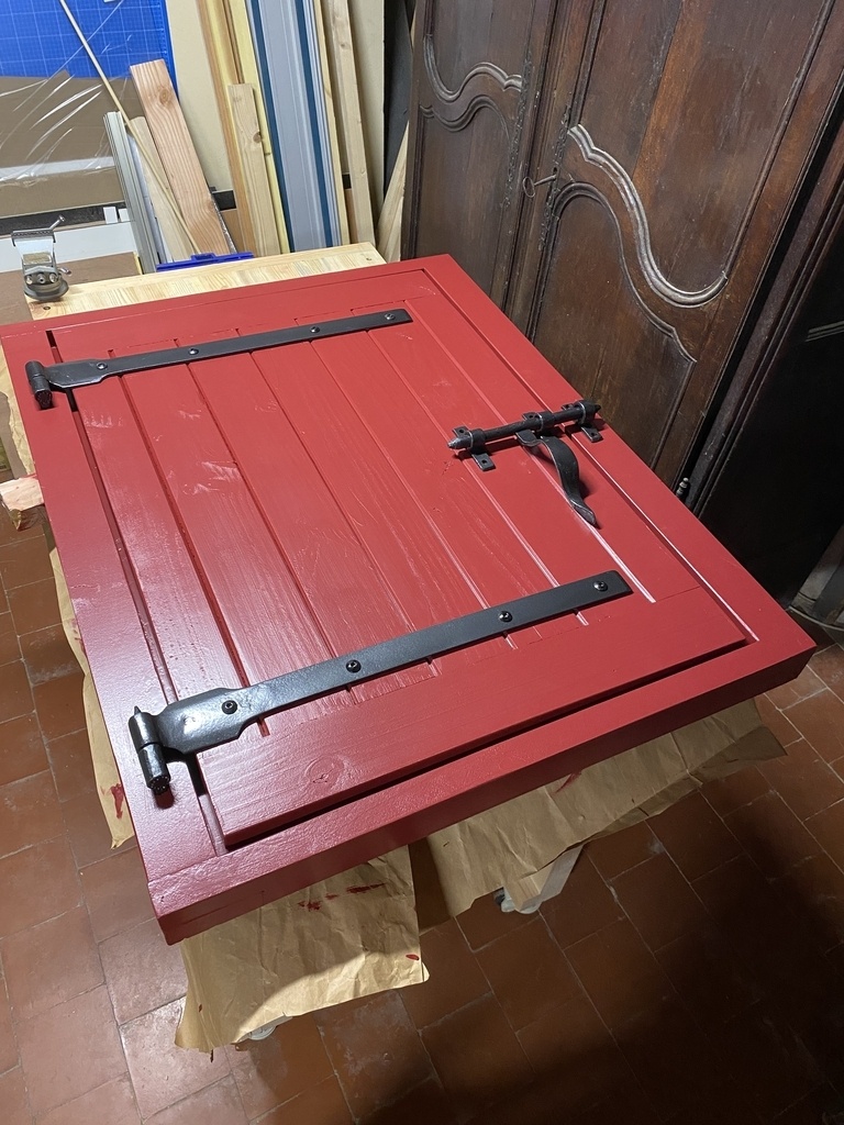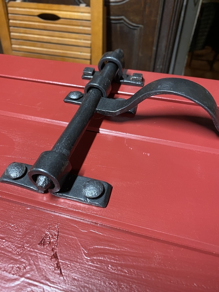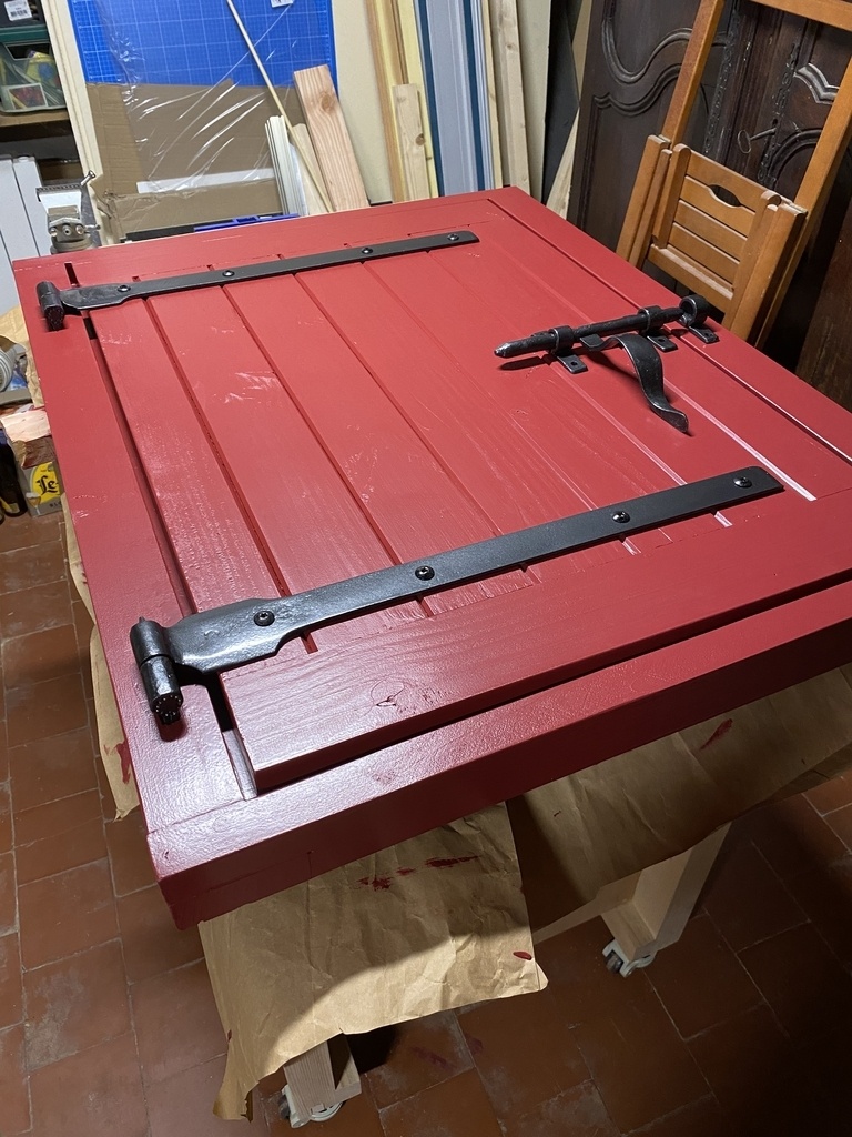 Après la fabrication du panneau et une belle peinture rouge Basque sur l'ensemble, et noir martelé pour les ferrures .
