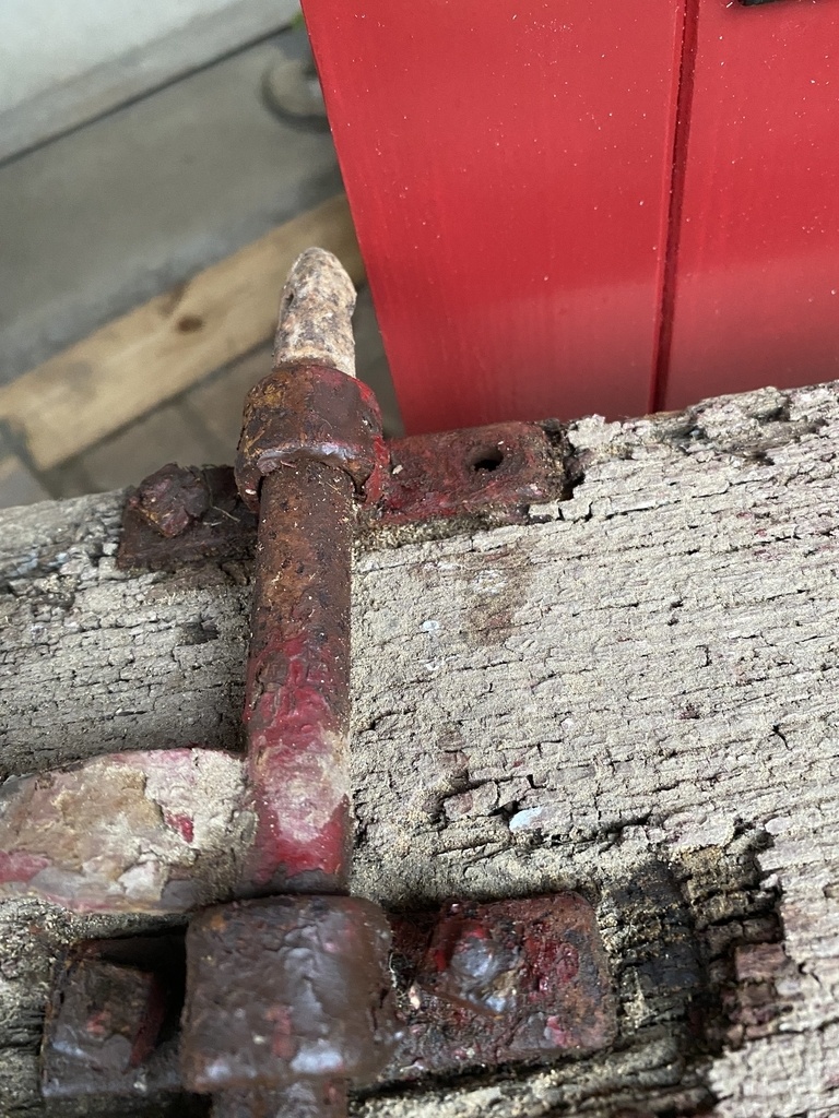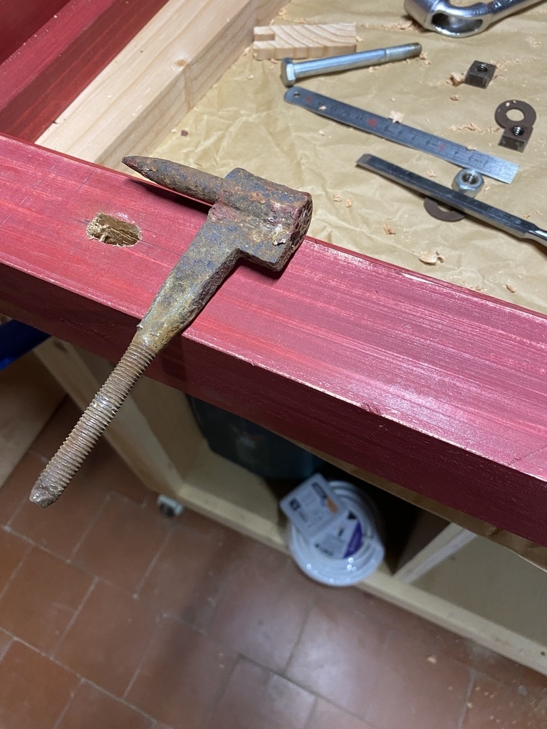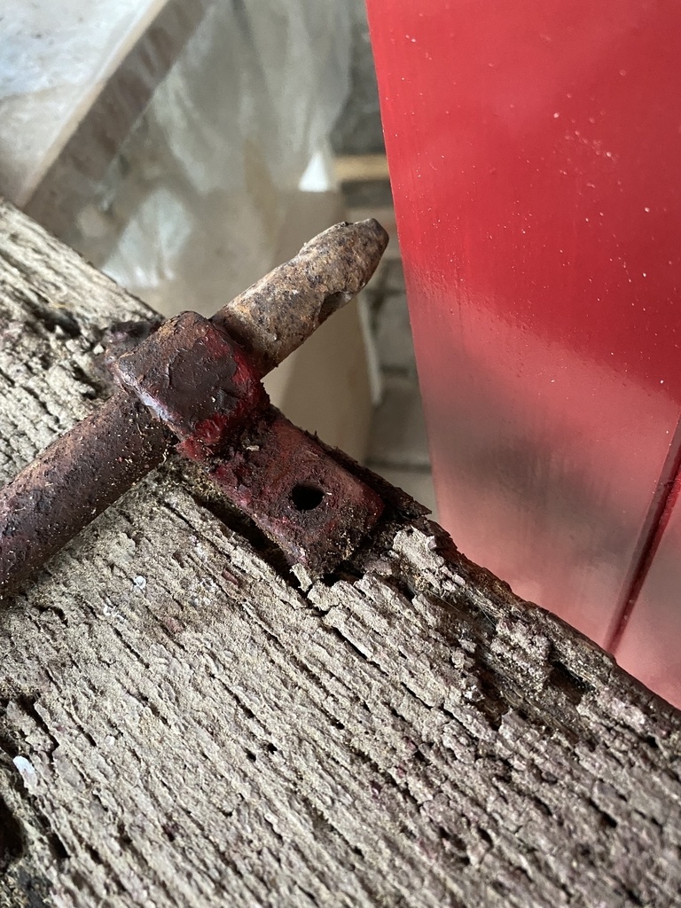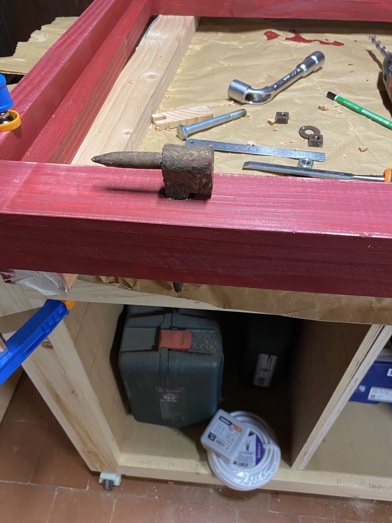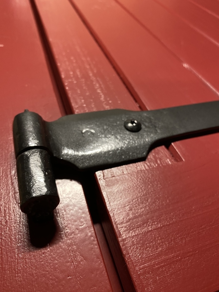 Après la fabrication du panneau et une belle peinture rouge Basque sur l'ensemble, et noir martelé pour les ferrures .