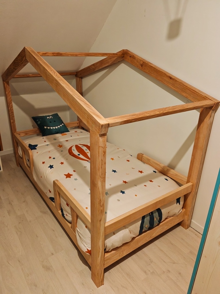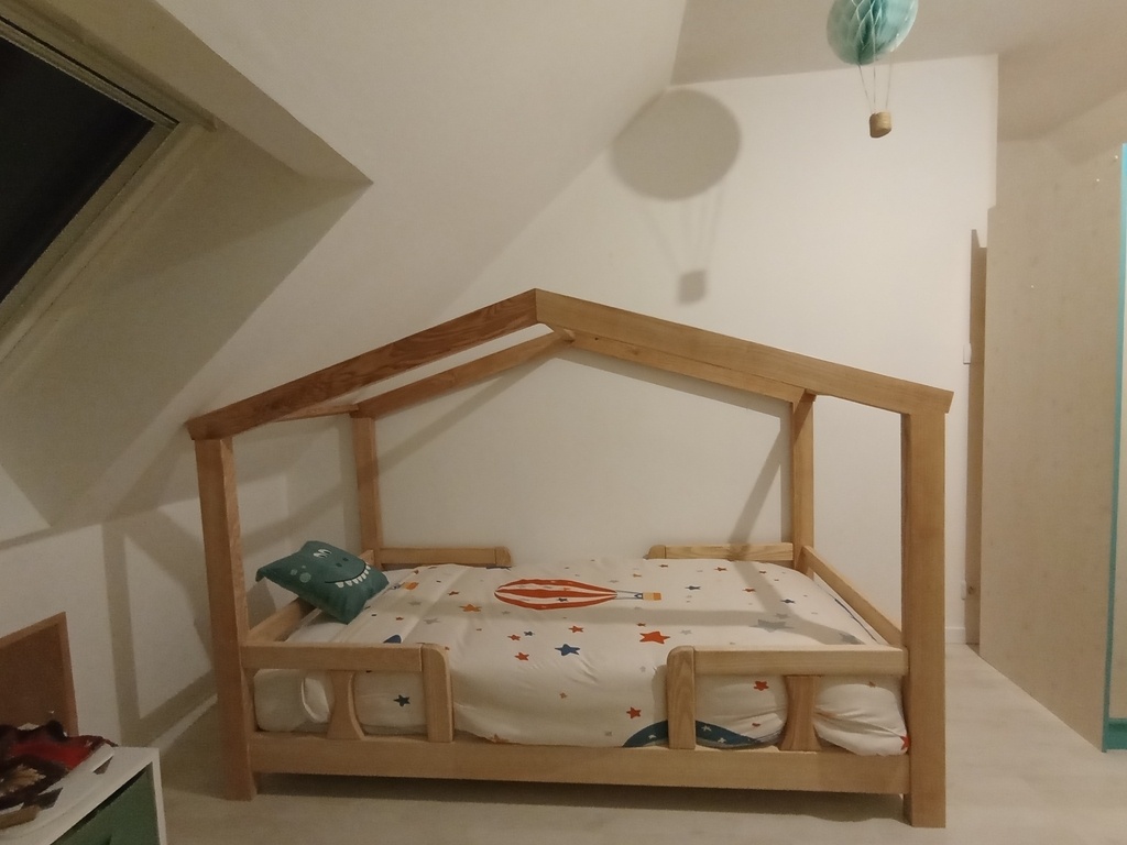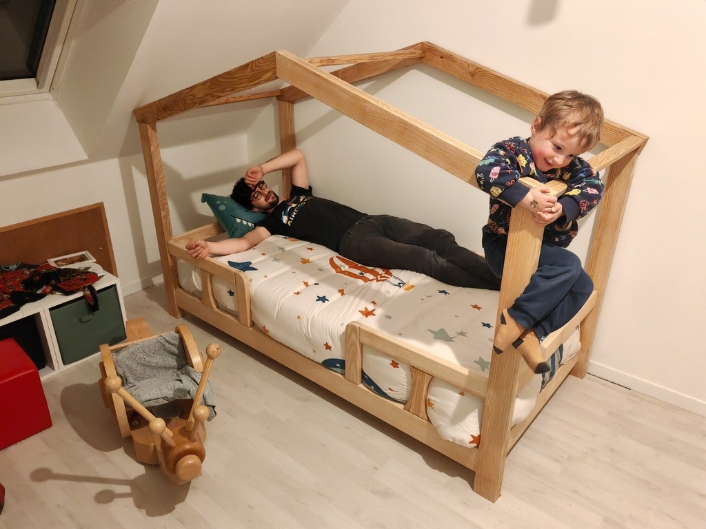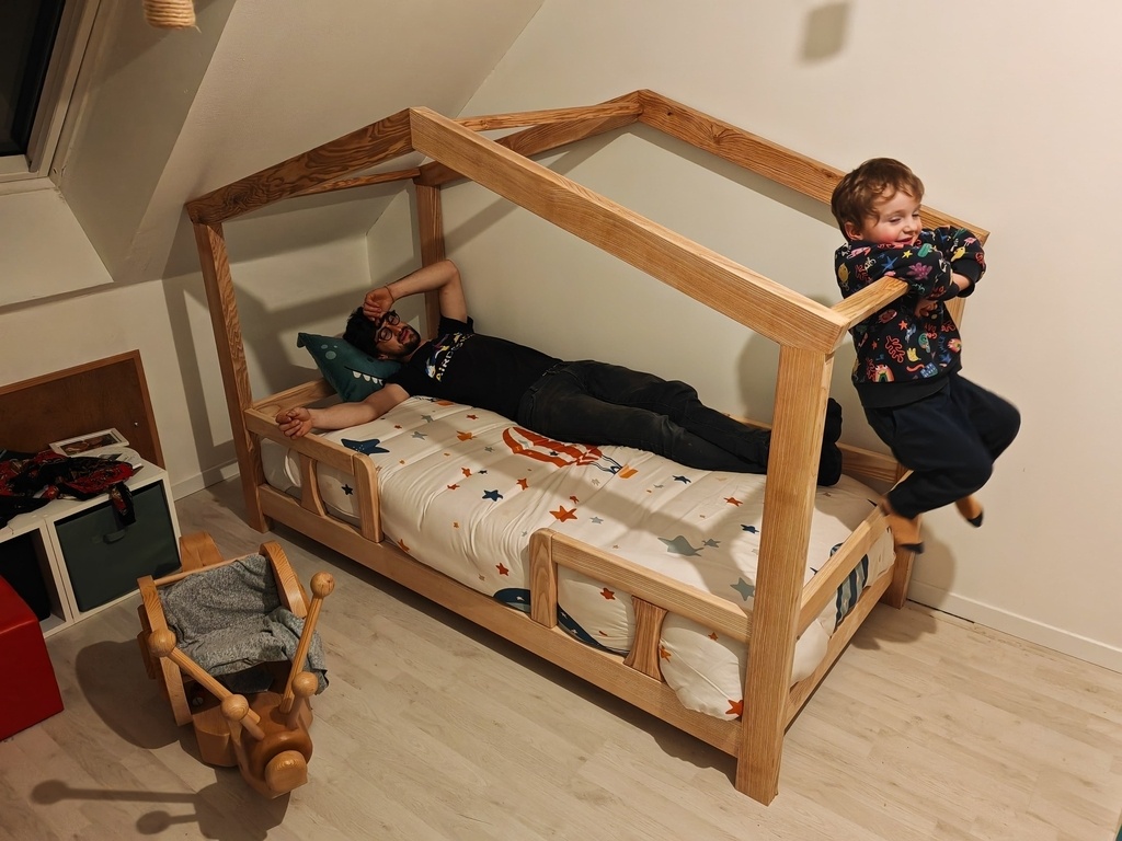 Comme mon fil grandit vite et que je n'ai pas vu le temps passer, il est maintenant à l'étroit dans son lit à barreaux, alors en bon mouton que je suis j'ai suivi la mode et me suis lancé dans la construction d'un lit cabane.