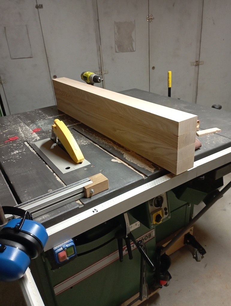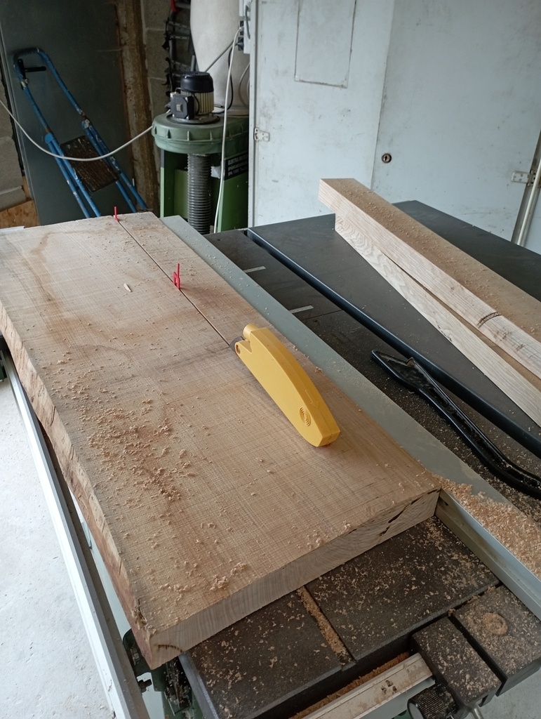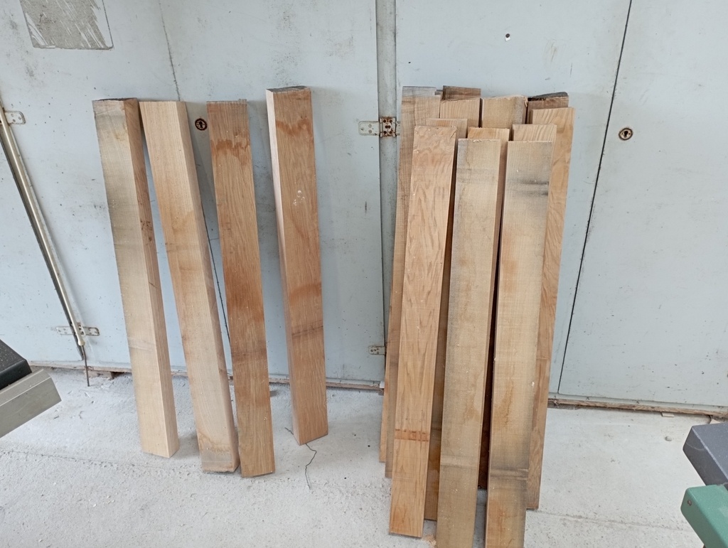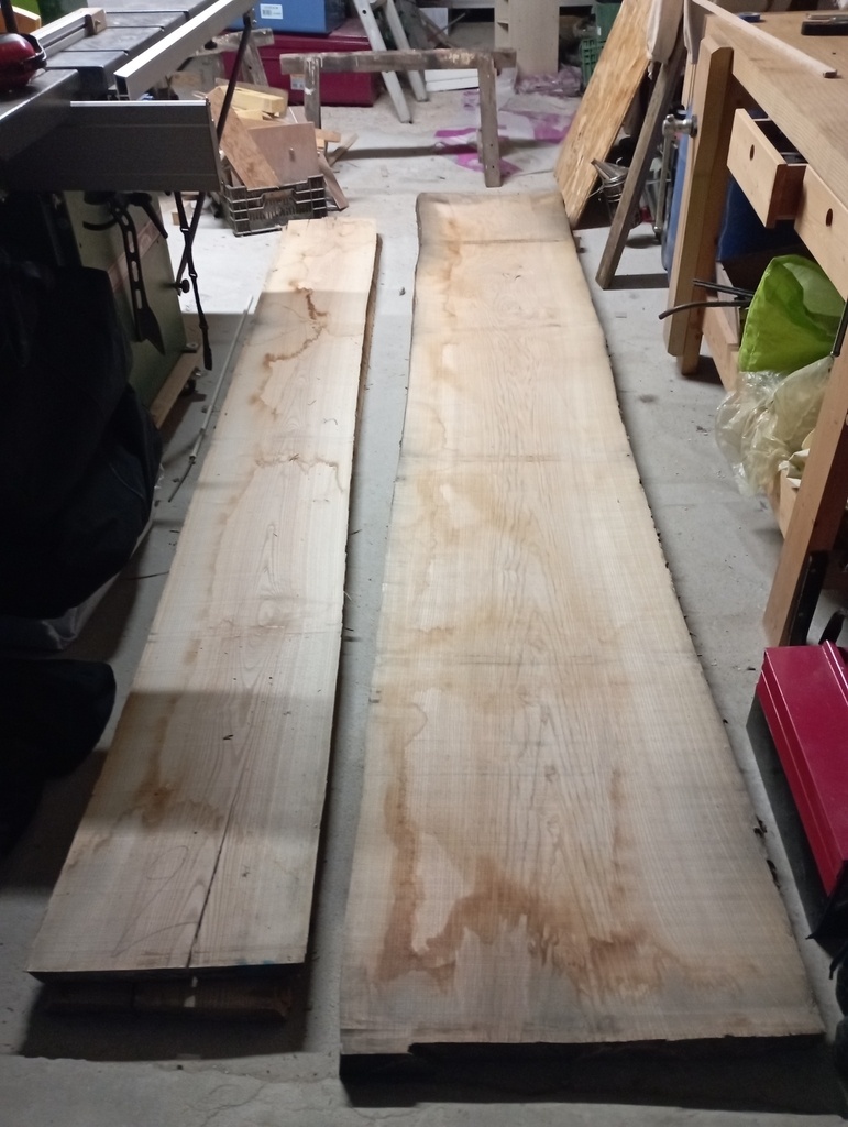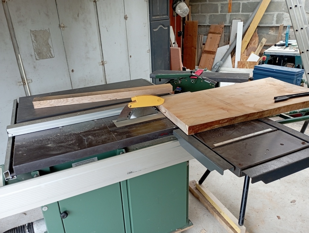 J'ai choisi de partir sur du frêne, mais aucun idée d'où aller l'acheter. Après un rapide passage chez deux négoces bois de Caen, je comprends que je ne les intéresse pas pour un si petit volume. Je me rabats donc sur Dispano, et achète deux plateaux en 34mm et un en 54mm. Je vous passe la galère pour rapporter ça chez moi et les décharger tout seul ...