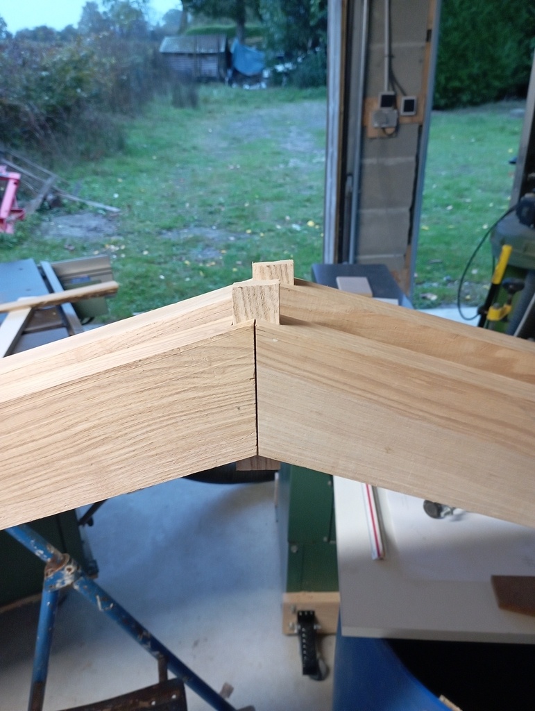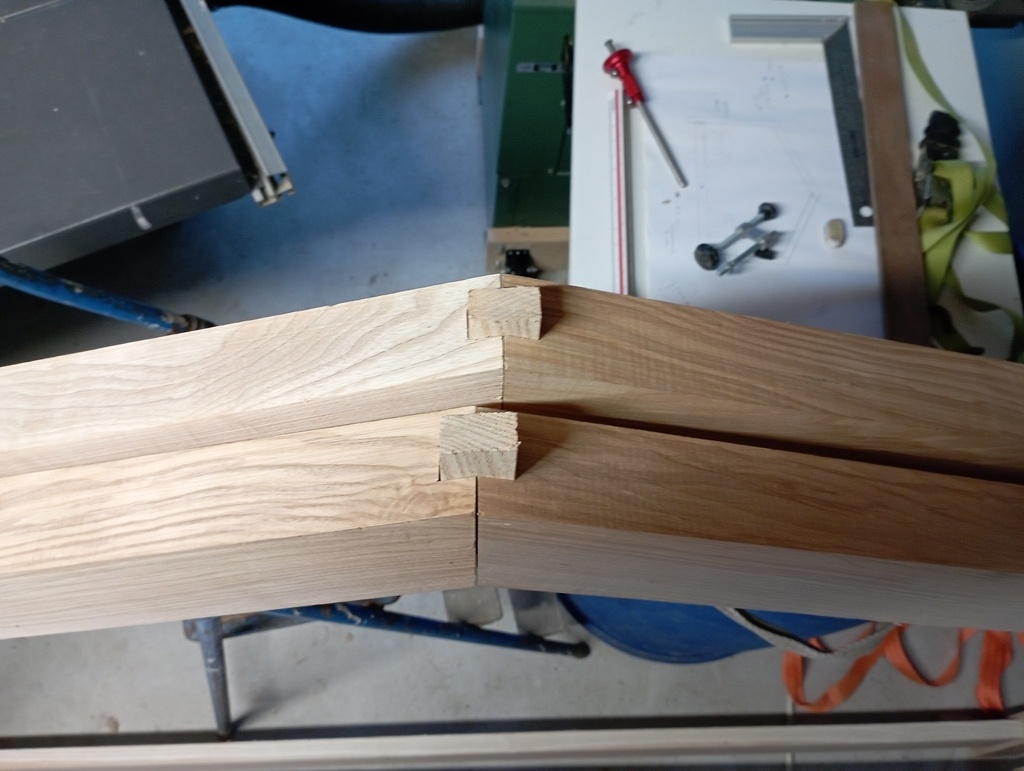 Je vais donc devoir revoir les assemblages prévus. Finalement j'opte pour un assemblage à fausse languette au faitage.