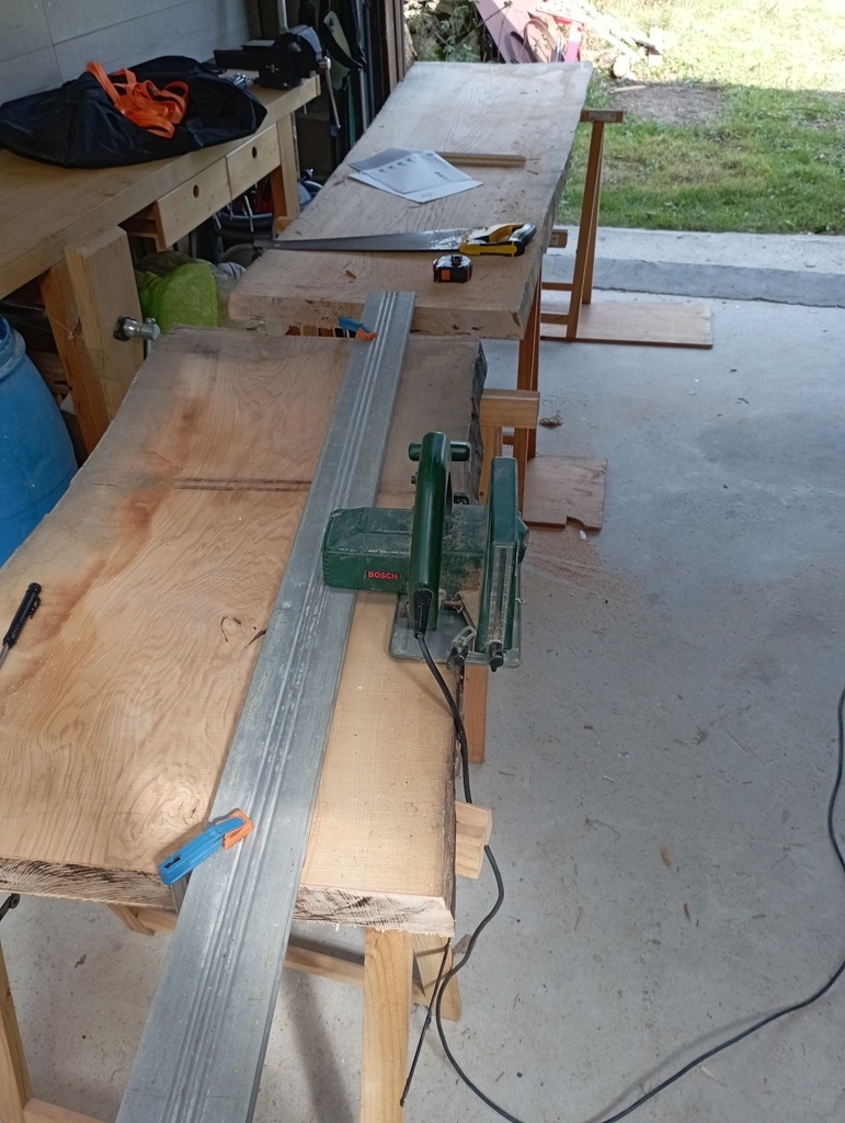 Bien évidemment je ne suis pas équipé pour couper de tels morceaux! Alors j'ai improvisé comme j'ai pu, à l'aide de la circulaire portative et d'une règle de maçon. J'essaie d'optimiser au mieux mes découpes et je suis bien stressé, parce qu'au prix du panneau de 54mm il ne faut pas se foirer...
