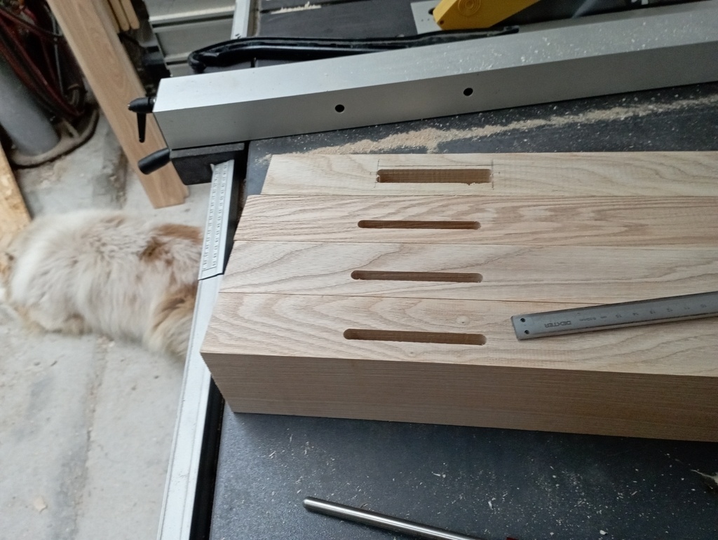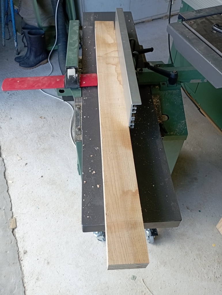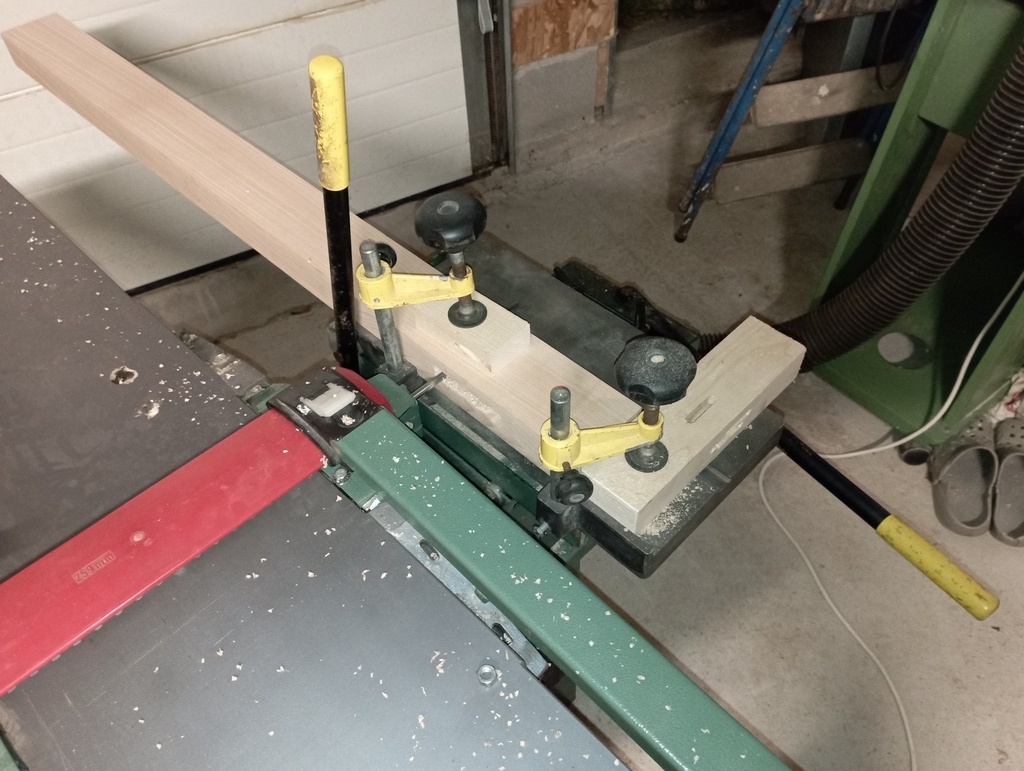 Quand j'ai acheté les machines, j'ai eu avec une mortaiseuse 652 sans moteur. Je n'ai pas trop le temps de m'occuper de mettre ça en place, alors heureusement après pas mal de recherches j'ai pu trouver sur leboncoin une mortaiseuse à ajouter à la 637 pas loin de chez moi et pour pas cher, ça me satisfait bien dans un premier temps. Je passe un peu de temps à la monter et la régler, puis un essai dans un martyr, une cale pour la reproductibilité et c'est parti pour le travail à la chaîne.