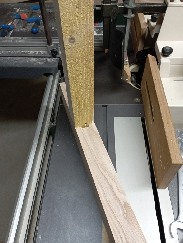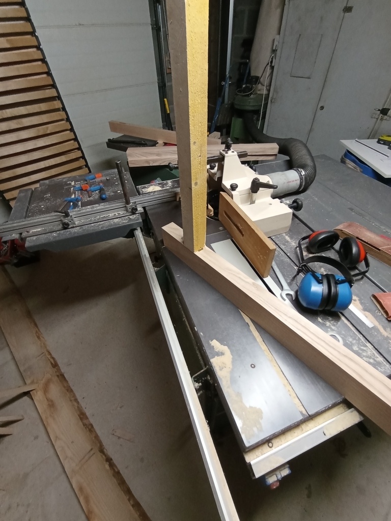Passage sur la toupie pour les tenons. Là aussi le confort de travail et la sécurité n'ont rien à voir avec ma vieille Lurem, c'est un plaisir!! Et l'aspiration fait des miracles par rapport aux montagnes de copeaux auxquelles je suis habitué. Test et réglages dans un martyr, puis c'est parti pour assembler deux pieds par une première traverse.