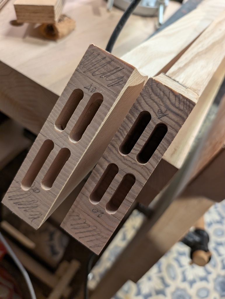 Pour faire les assemblages entre les morceaux des pieds/accoudoirs et pour l'assise/dos, voila comment je pense faire. Je me méfie des tenons/mortaises en bois de bout. Donc, je vais faire un sandwich: