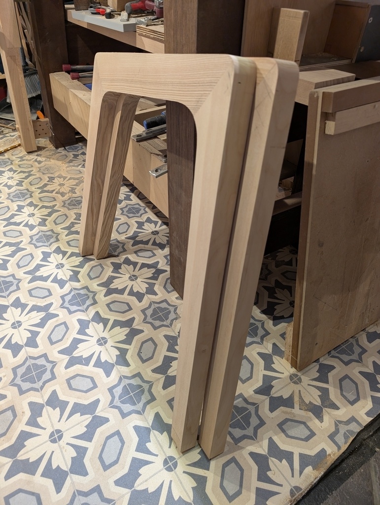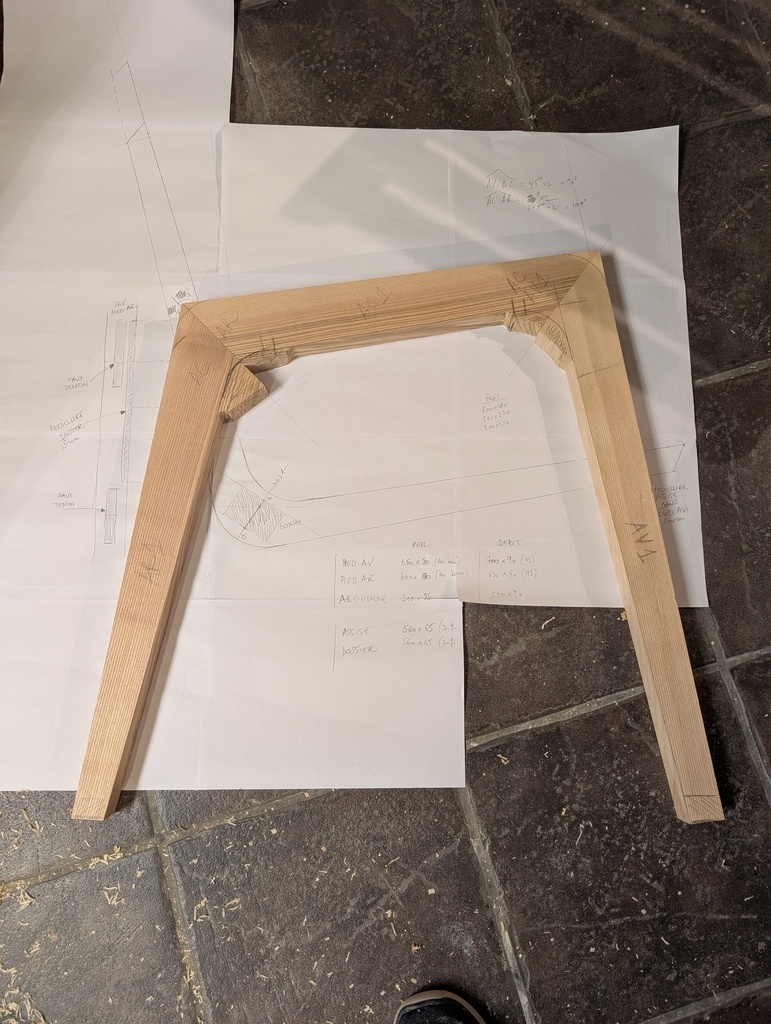 Je suis très satisfait du résultat (pour une première). J'ai un léger écart d'angle par rapport à l'épure, mais rien d'insurmontable. Par contre, cela va m'obliger à changer de stratégie pour le 2eme ensemble pied-accoudoir.