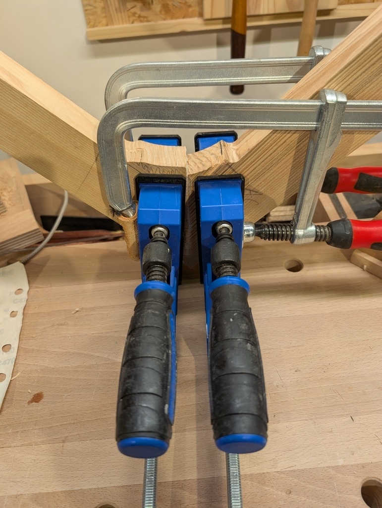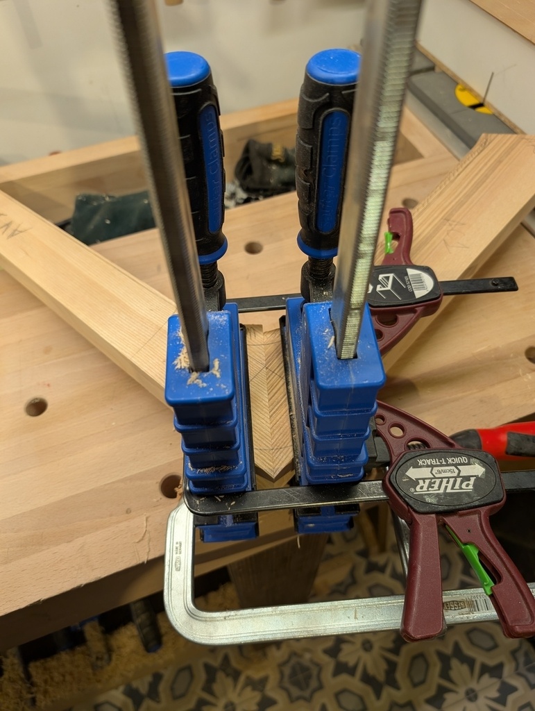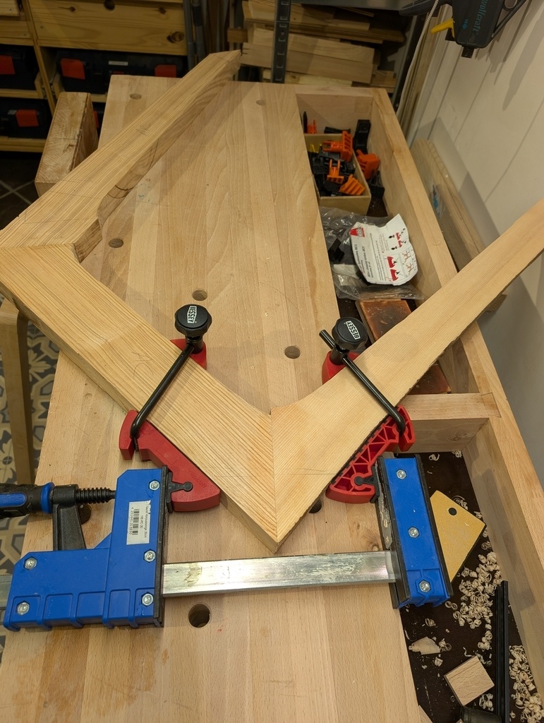 Le système Bessey pour collage en angle est très efficace, je recommande. Le collage s'est bien passé et le serrage a bien tenu toute la nuit sans se desserrer et sans glisser.