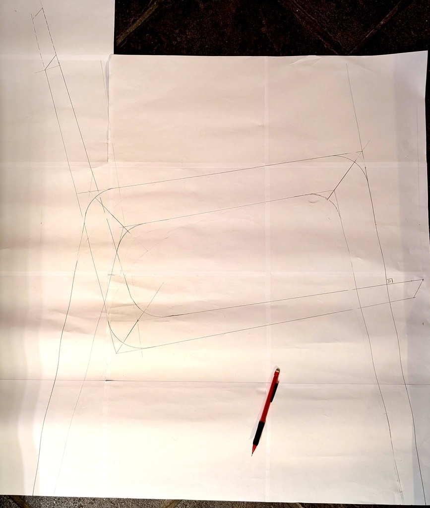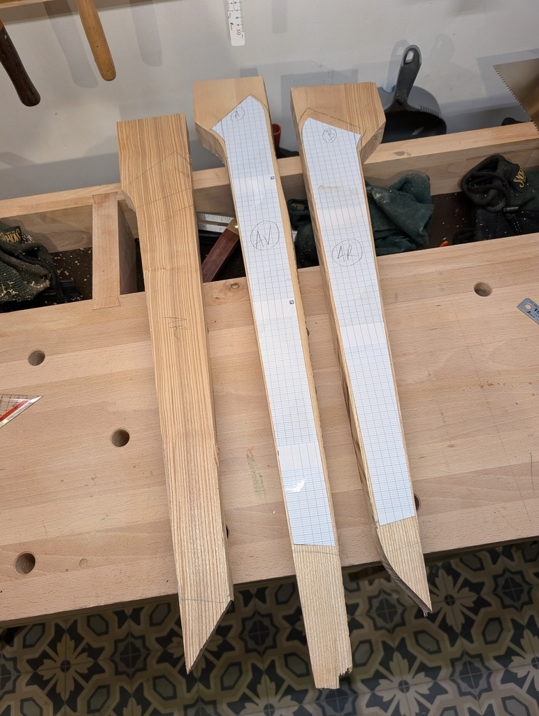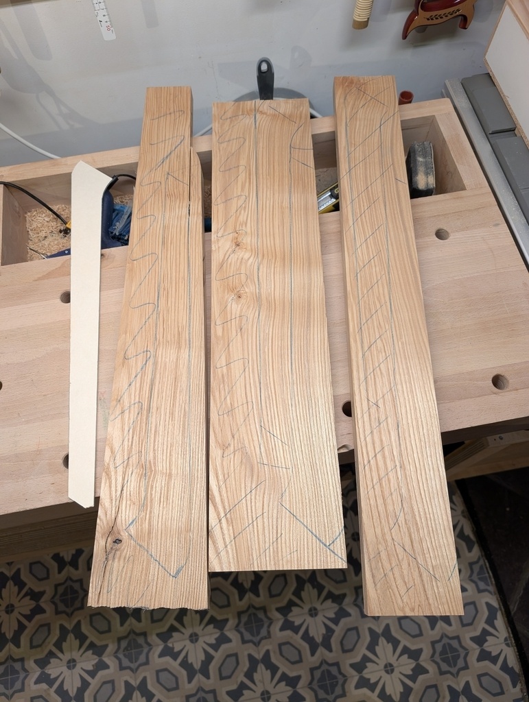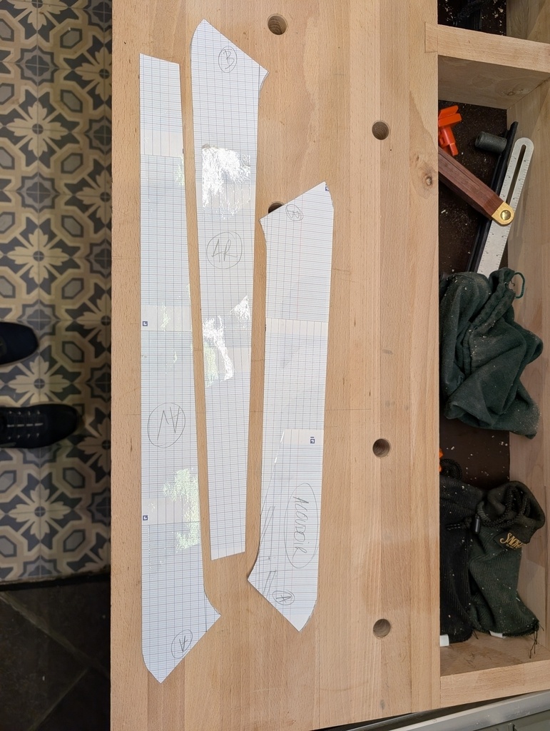 J'ai donc, après avoir préparé quelques planche de frêne de 35mm d'épais, préparé des gabarits papier pour les 2 fois 3 pièces de bois (pied avant, pied arrière et accoudoir).