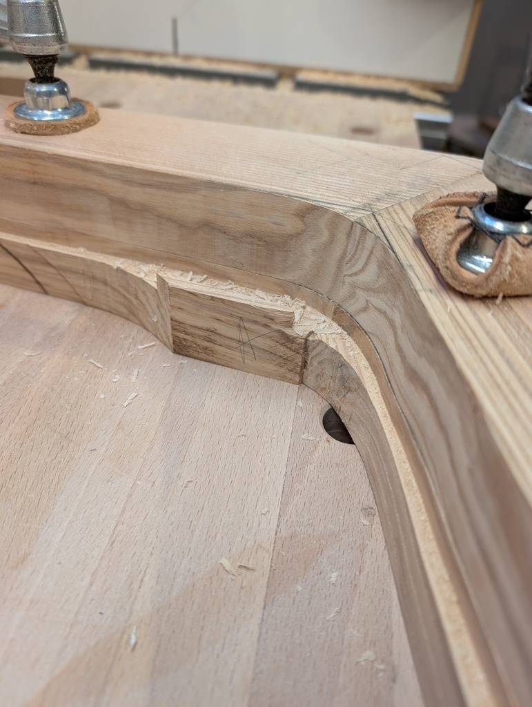 Pour le collage, moment de stress. Le premier n'est pas parfait et j'ai un léger écart de quelques dixièmes. Le deuxième est sous presse à l'heure ou j'écris et je pense qu'il sera de meilleure qualité. Idéalement, il faut laisser de la matière bien découpée pour pouvoir y appuyer les serre-joints.